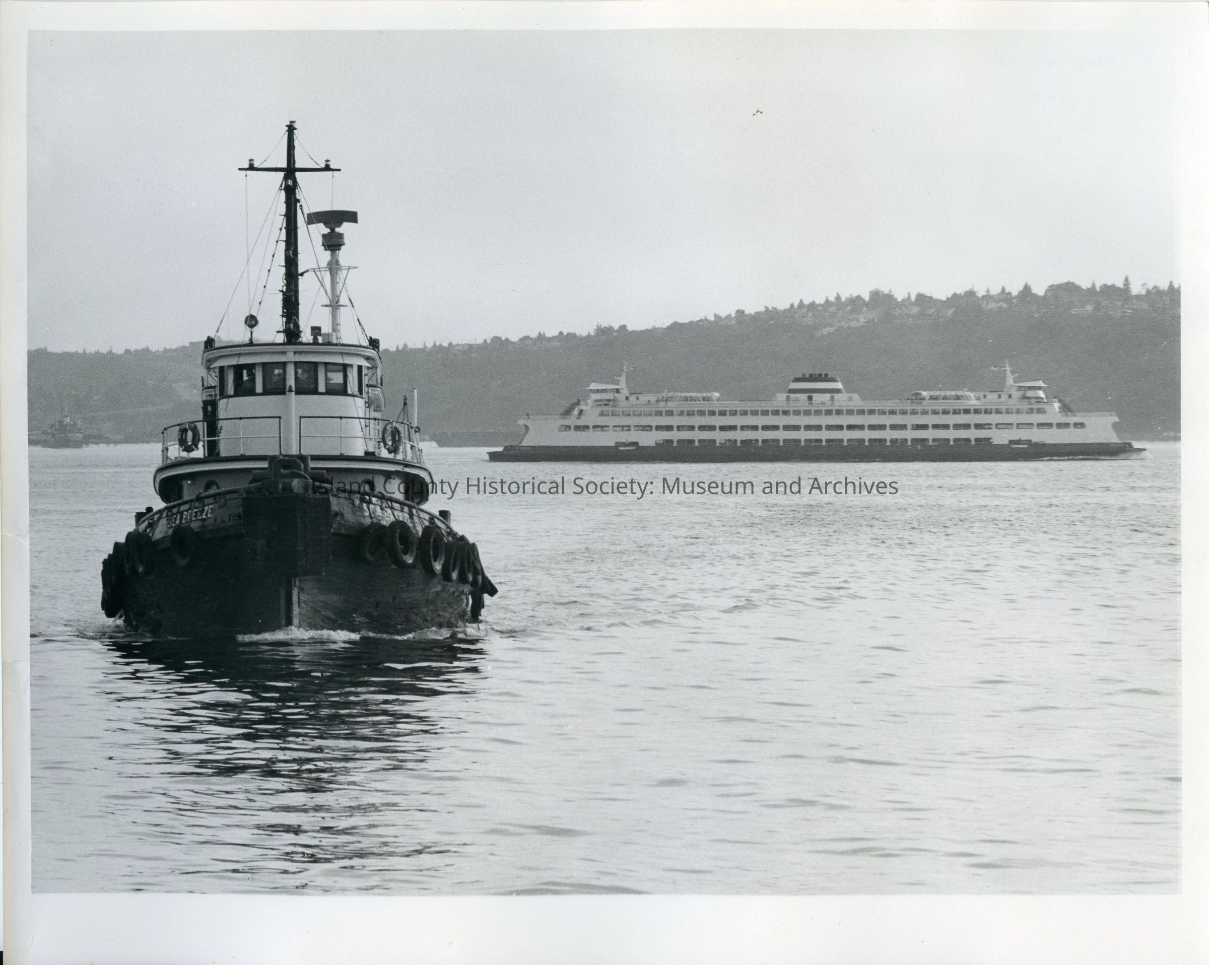 Photograph of the "Sea Breeze" with a large vehicle and passenger ferry behind it.