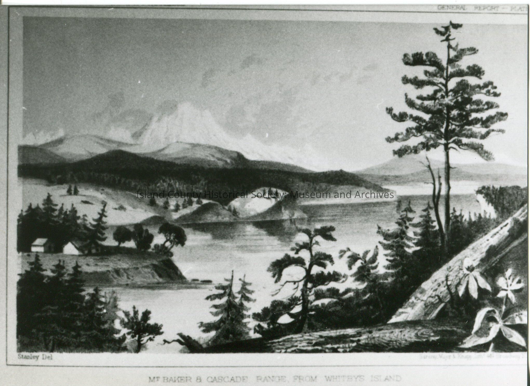 Black and white copy of a 5x7 photo of a print entitled Mt, Baker and Cascade Range from Whitbys Island. In the lower left corner the name Stanley Del appears. The picture shows Mt. Baker in the background with mountains, hills, trees, and a body of water. A pictoral scene showing the countryside surrounding Mt. Baker with some barn structures. In the upper right corner it states ""General Report - plate".Lexicon