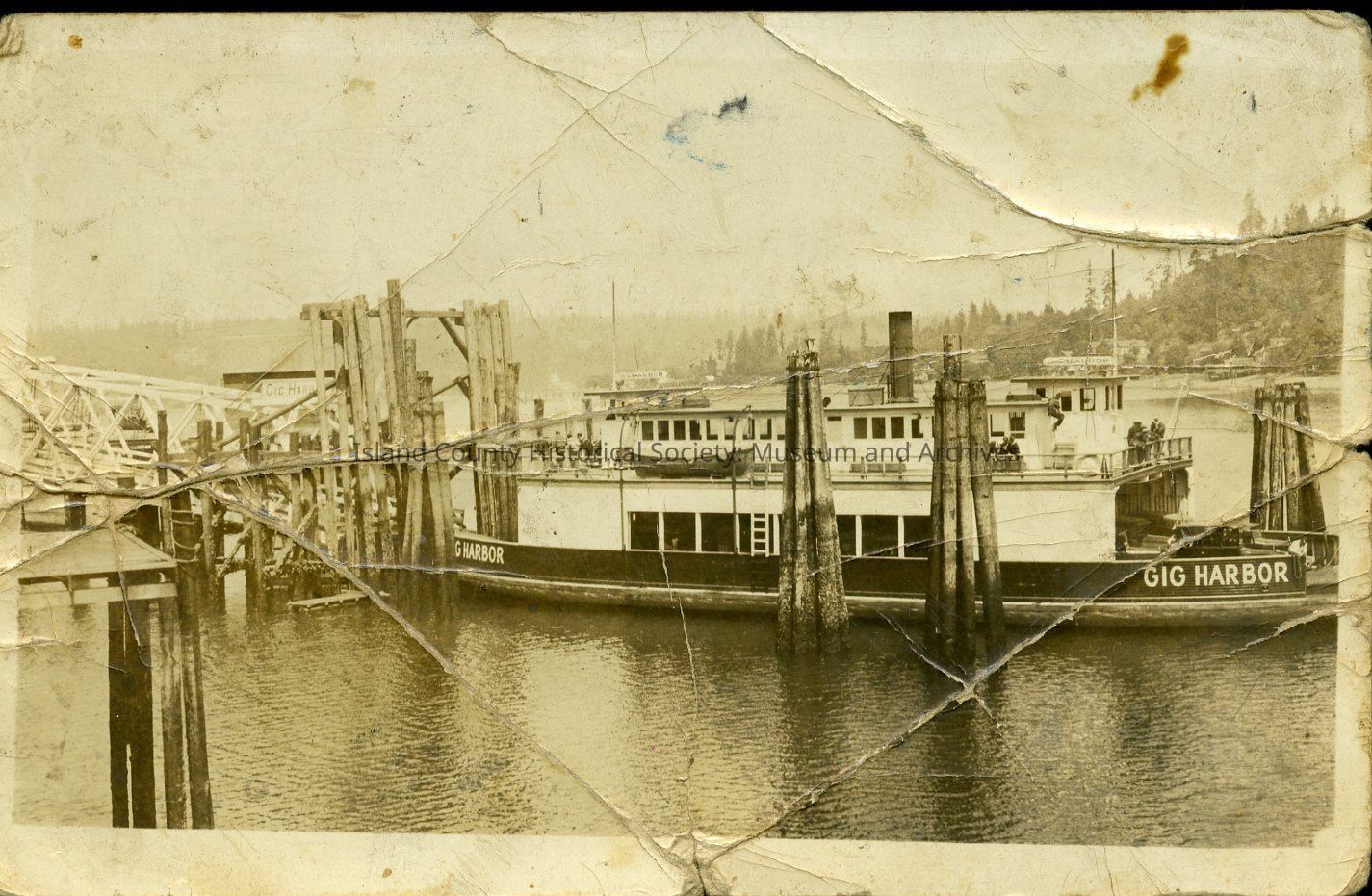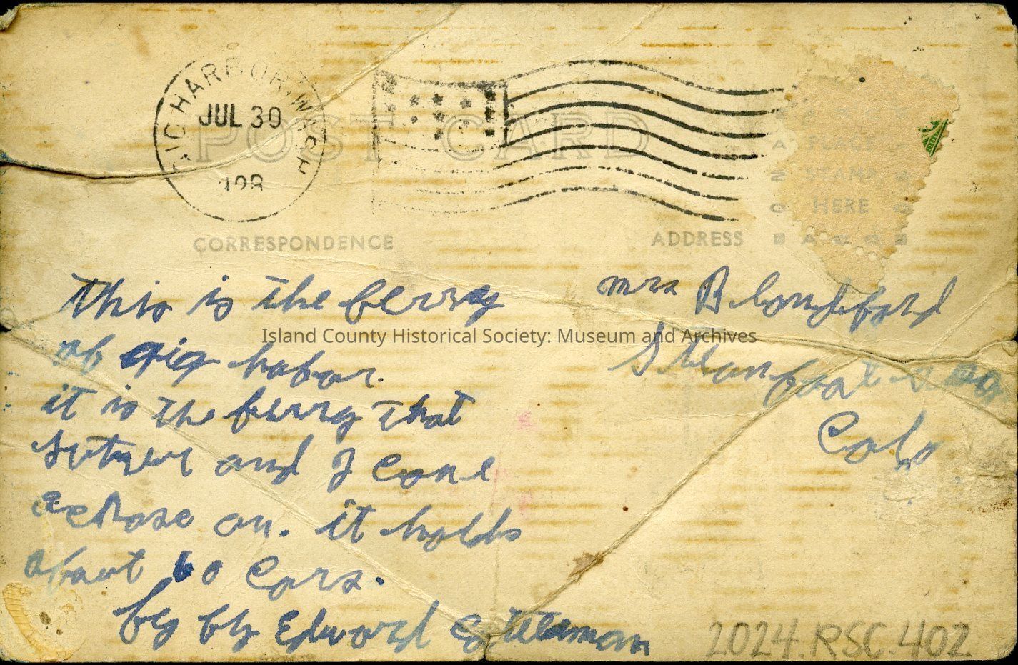 Postcard depicting a Gig Harbor ferry. Addressed to a Mrs. Blandoford [or Blomfoford, or Blondoford] of Steamboat Springs, Colorado. The reverse of the postcard reads, "This is the ferry of Gig Harbor. It is the ferry that [sister?] and I came across on. It holds about 60 cars. By by Edward [Steldman or Soteldman]" Postmarked 30 July 1928, Gig Harbor.