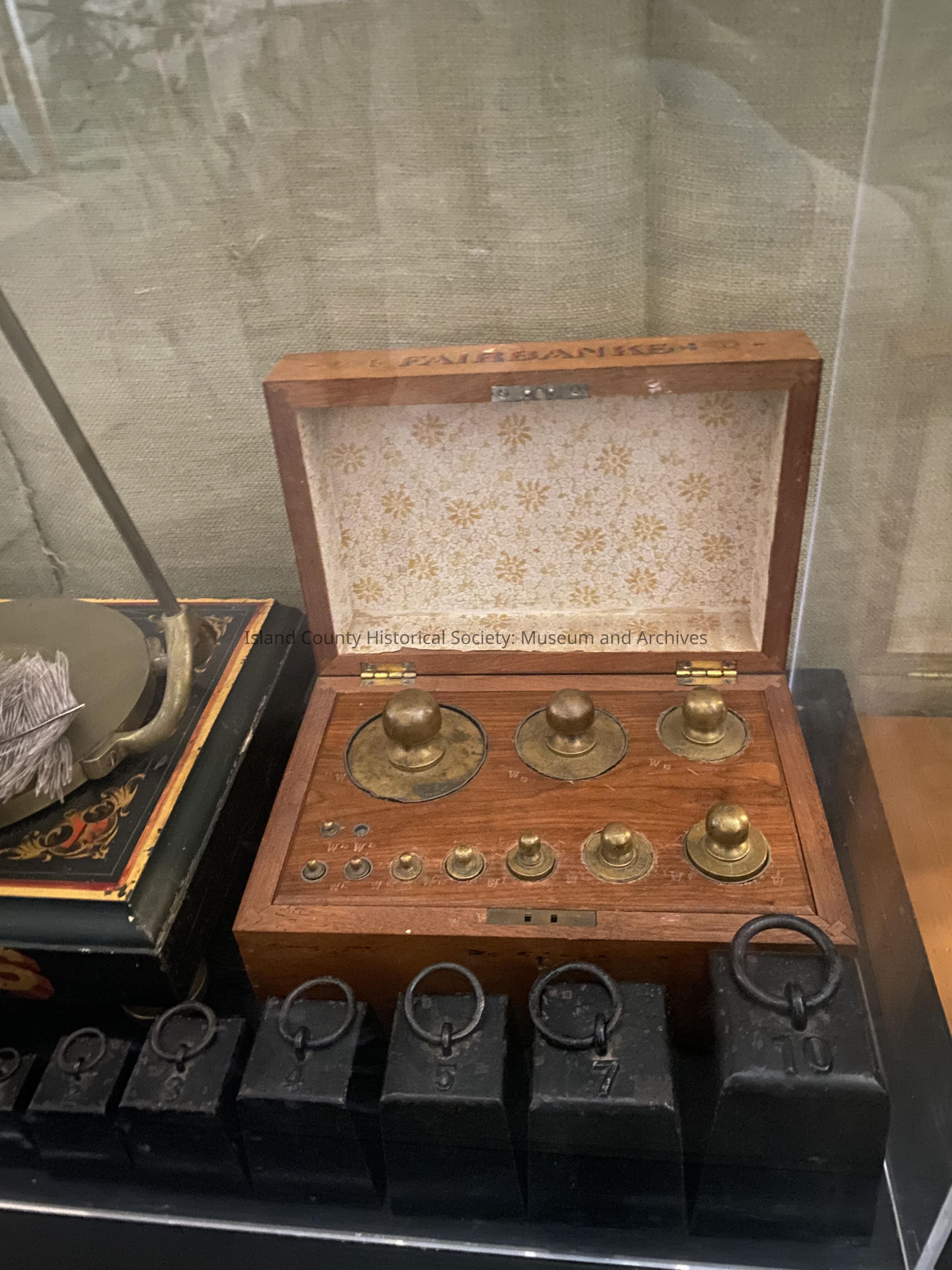 Walnut chest containing weights for Fairbanks scale - 1/16 oz weight missing. Used by the Island County Auditor to certify and measure in Island County.