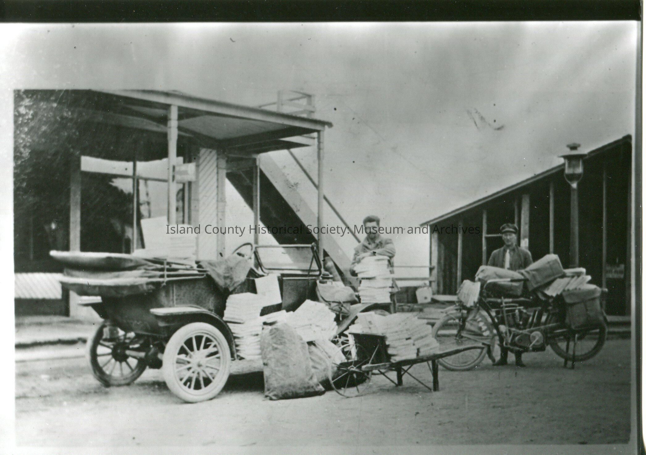 A black and white photograph showing early transportation. Photo shows picture of an automobile and next to the automobile is a motorcycle. Both vehicles transporting supplies. A wheelbarrel is full of bags. Two male adults are standing at the vehicles with some burlap bags leaning against the vehicle. The photo also shows structures and a light post.