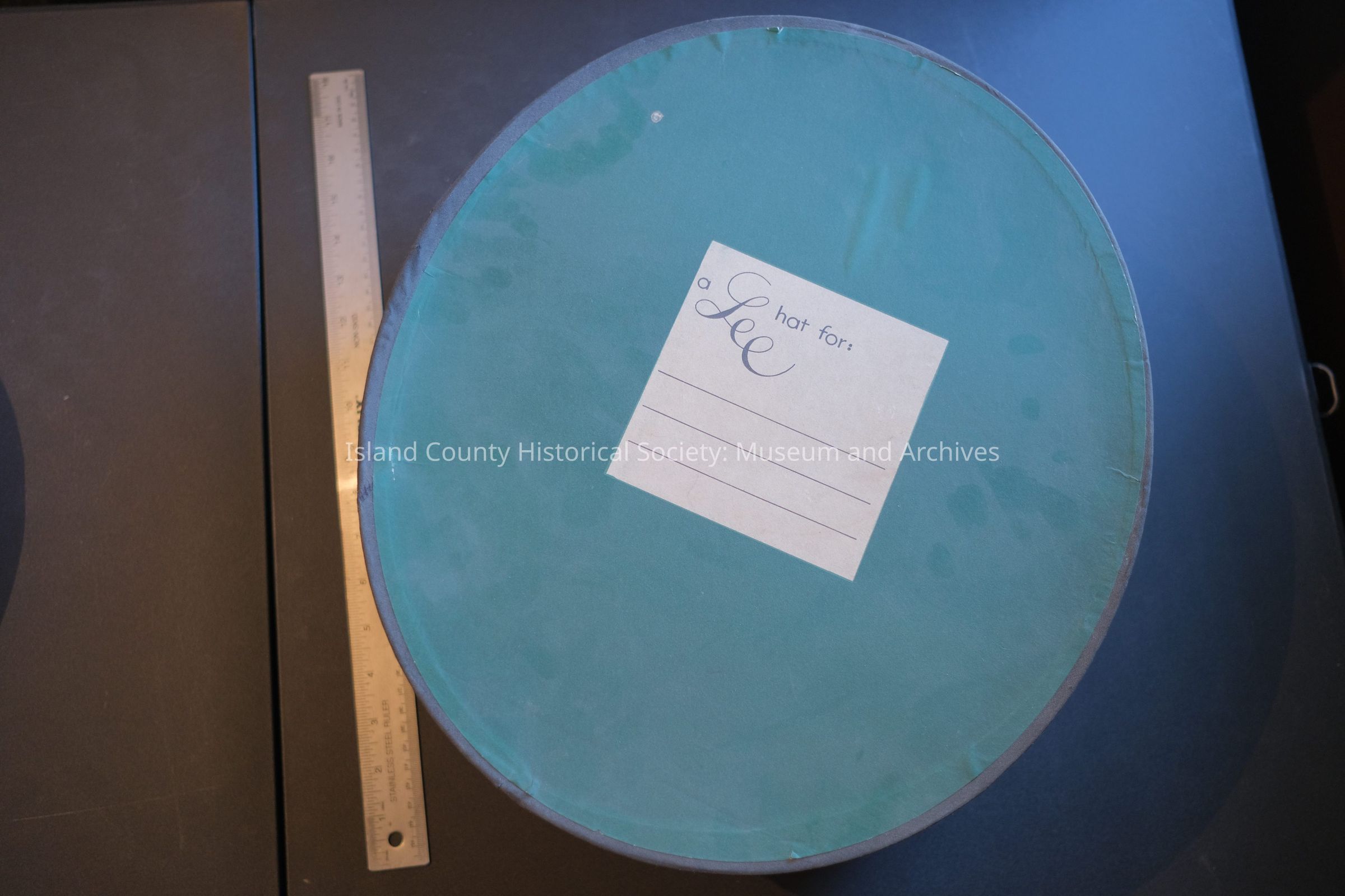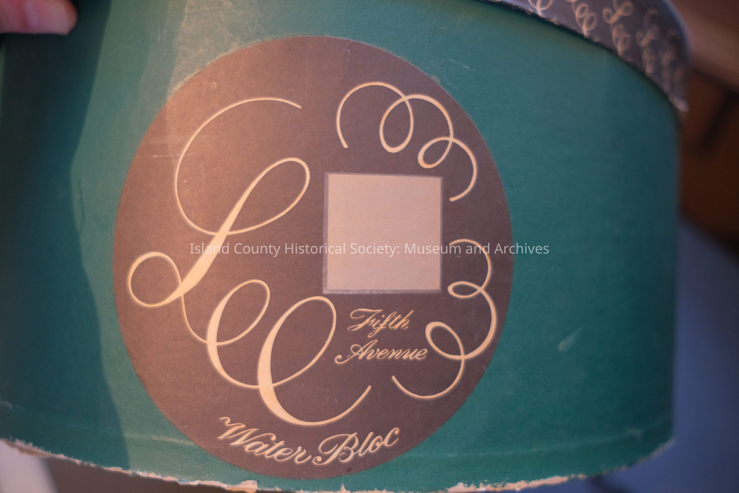 Teal hat box, "A Lee Hat For:", Fifth Avenue