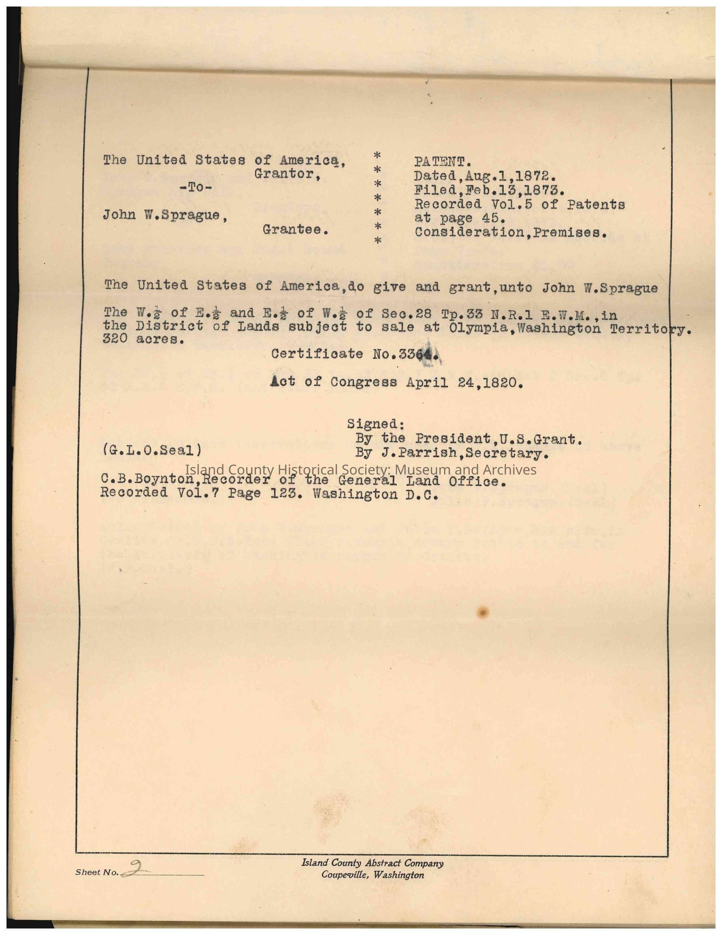 Abstract of Title for a portion of land on Whidbey Island, granted to John W. Sprague, by the United States of America, consisting of a total of 320 acres. Dated 01 August 1872, filed 13 February 1873.