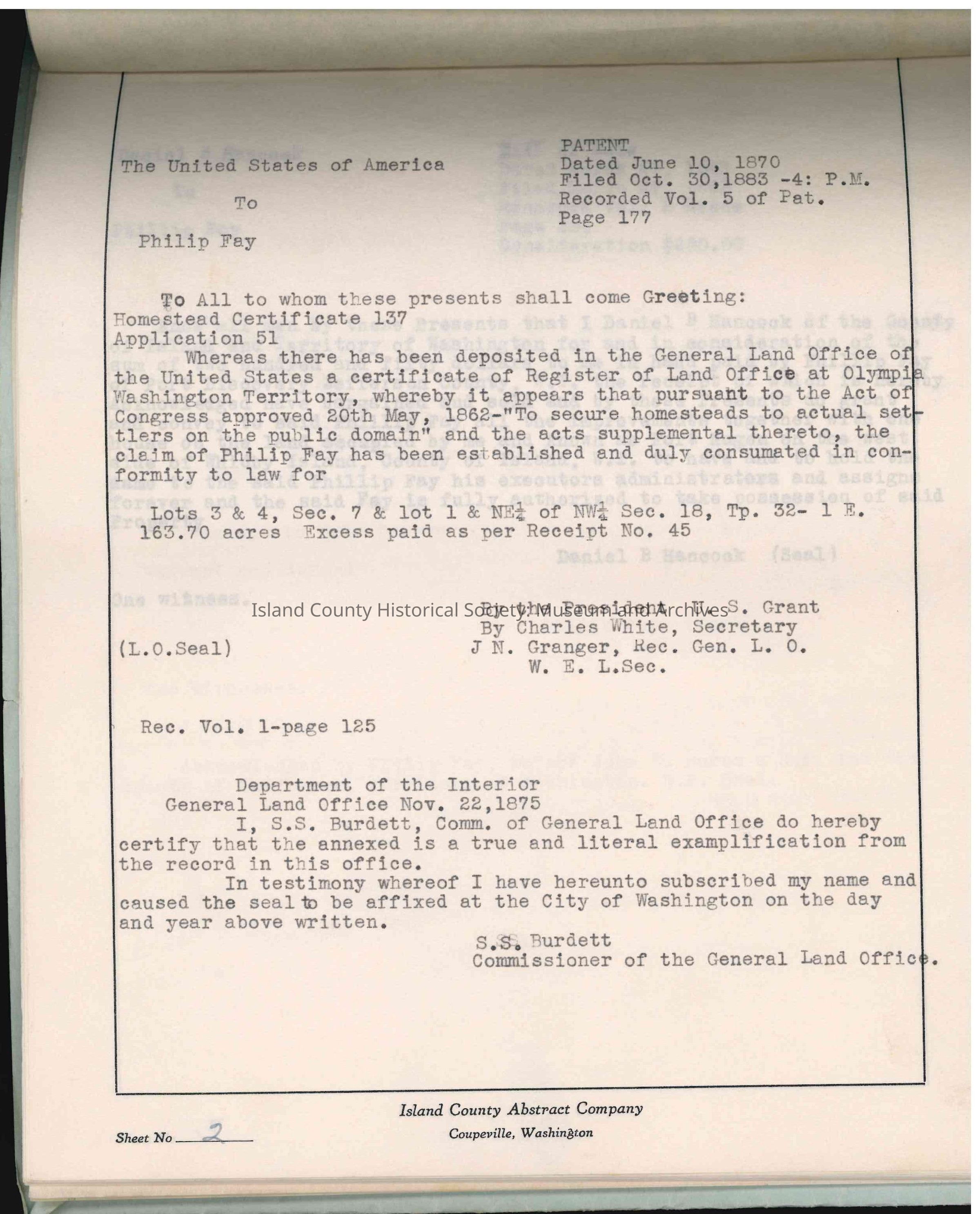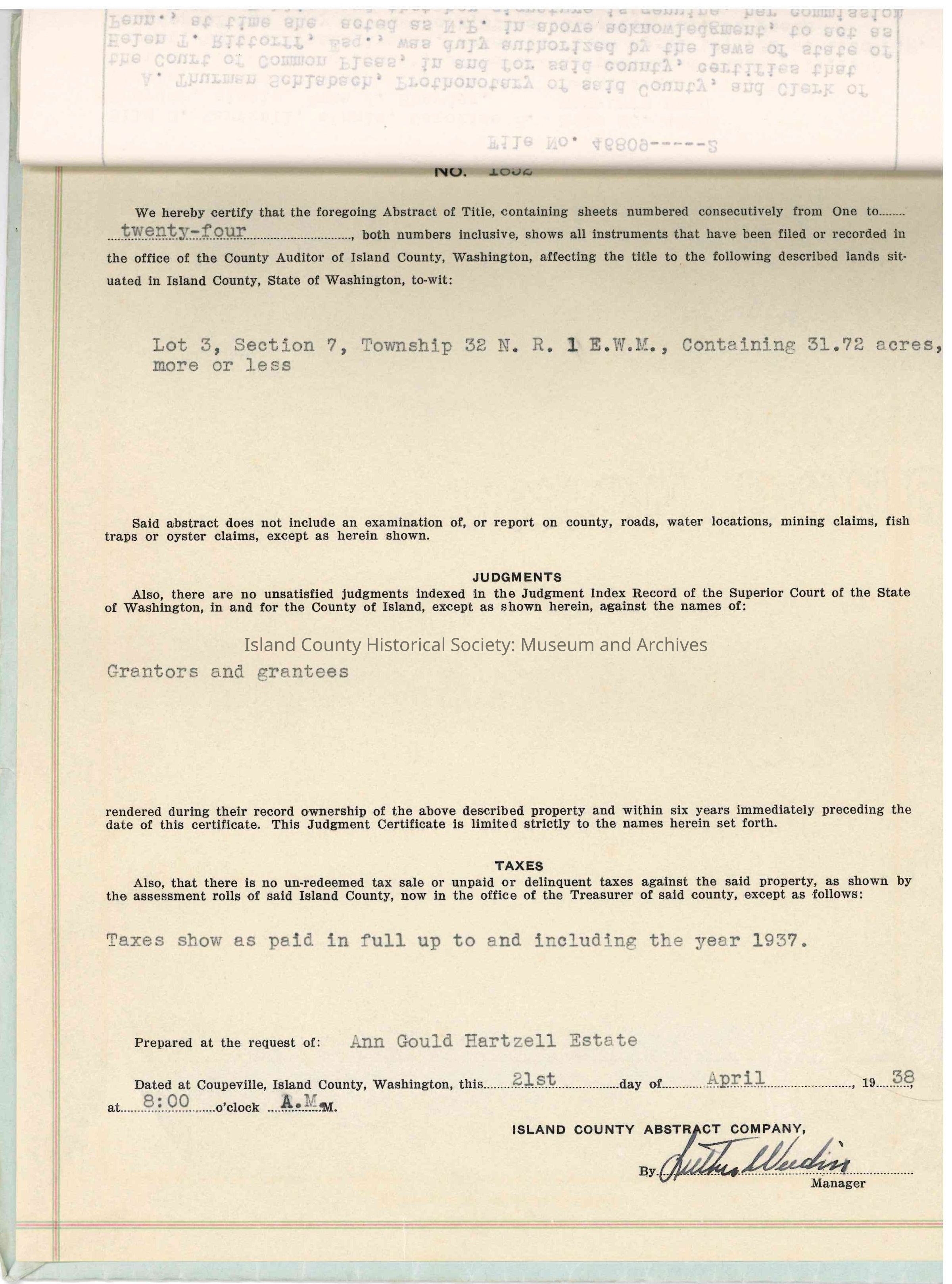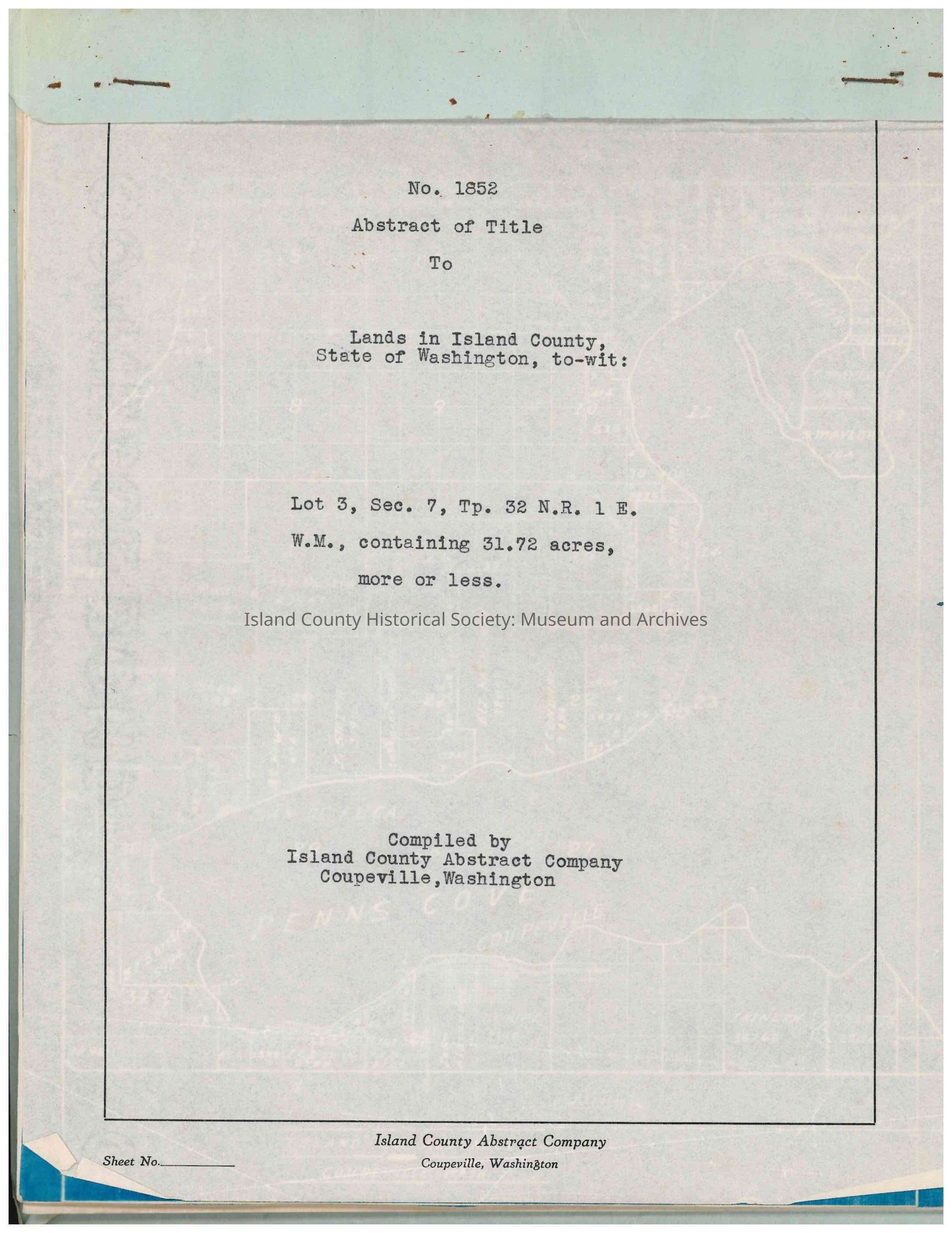 Abstract of Title for "Lot 3, Sec. 7, Tp. 32 N.R. 1 E.W.M., containing 31.72 acres, more or less" in Island County. Dated from 1870 to 1938.