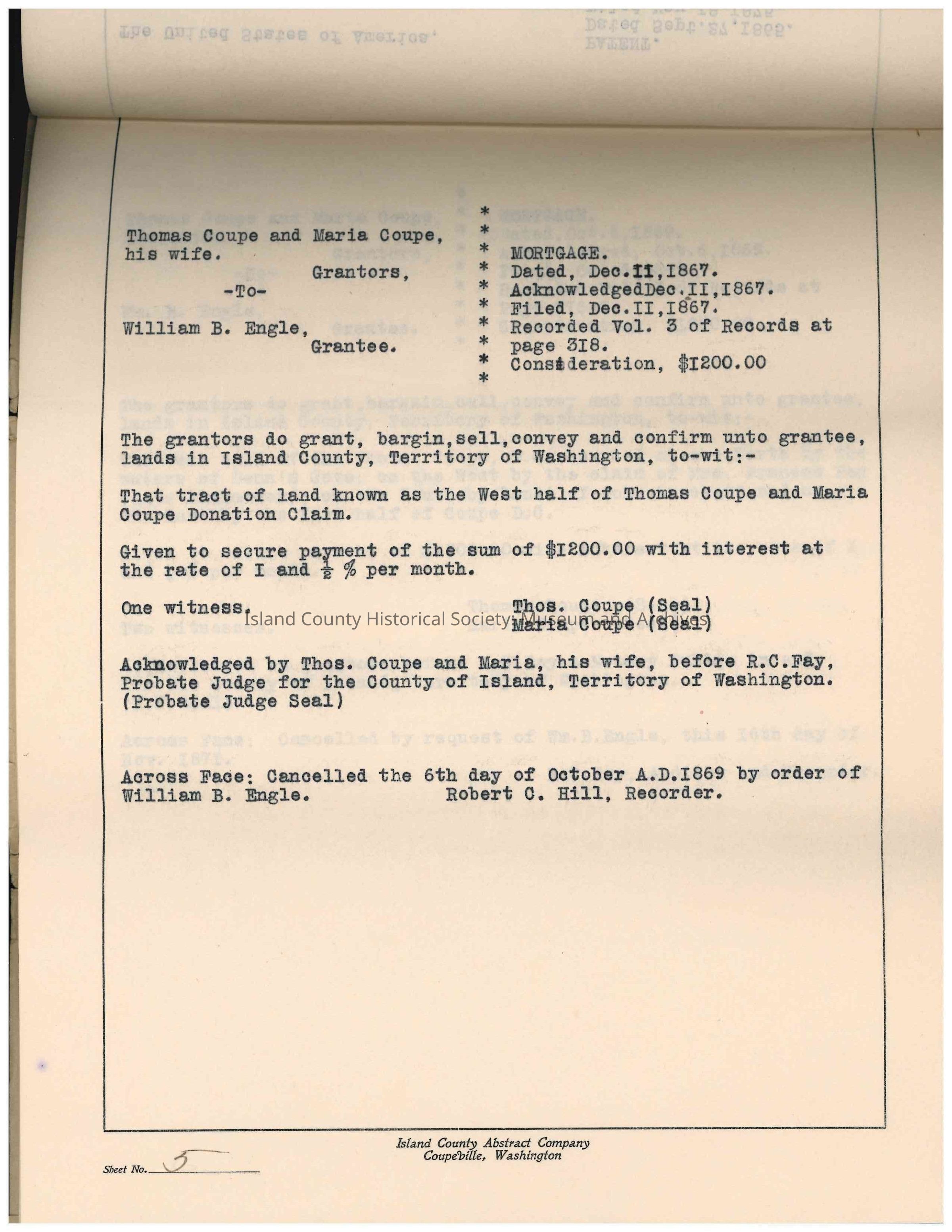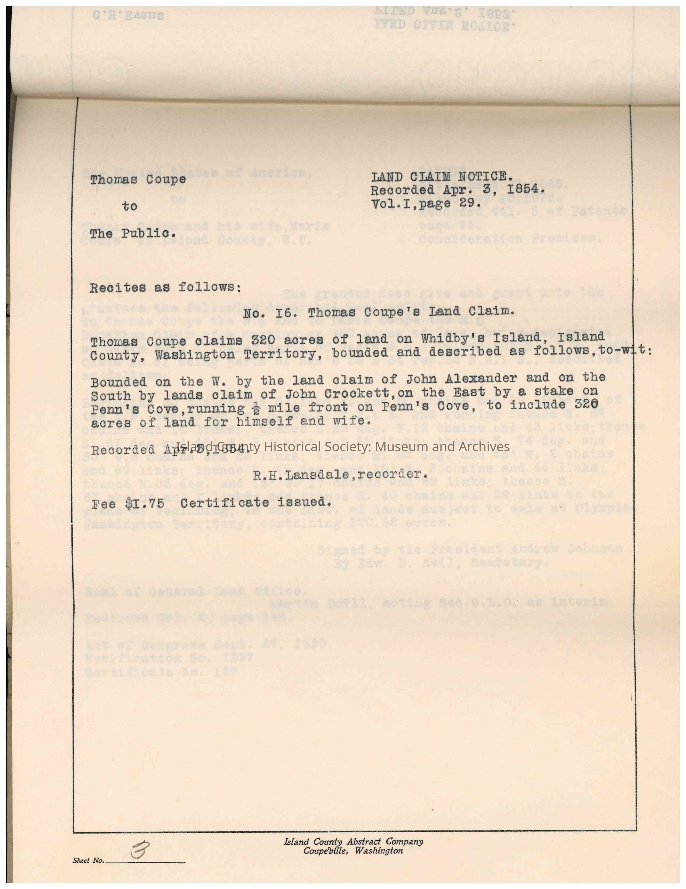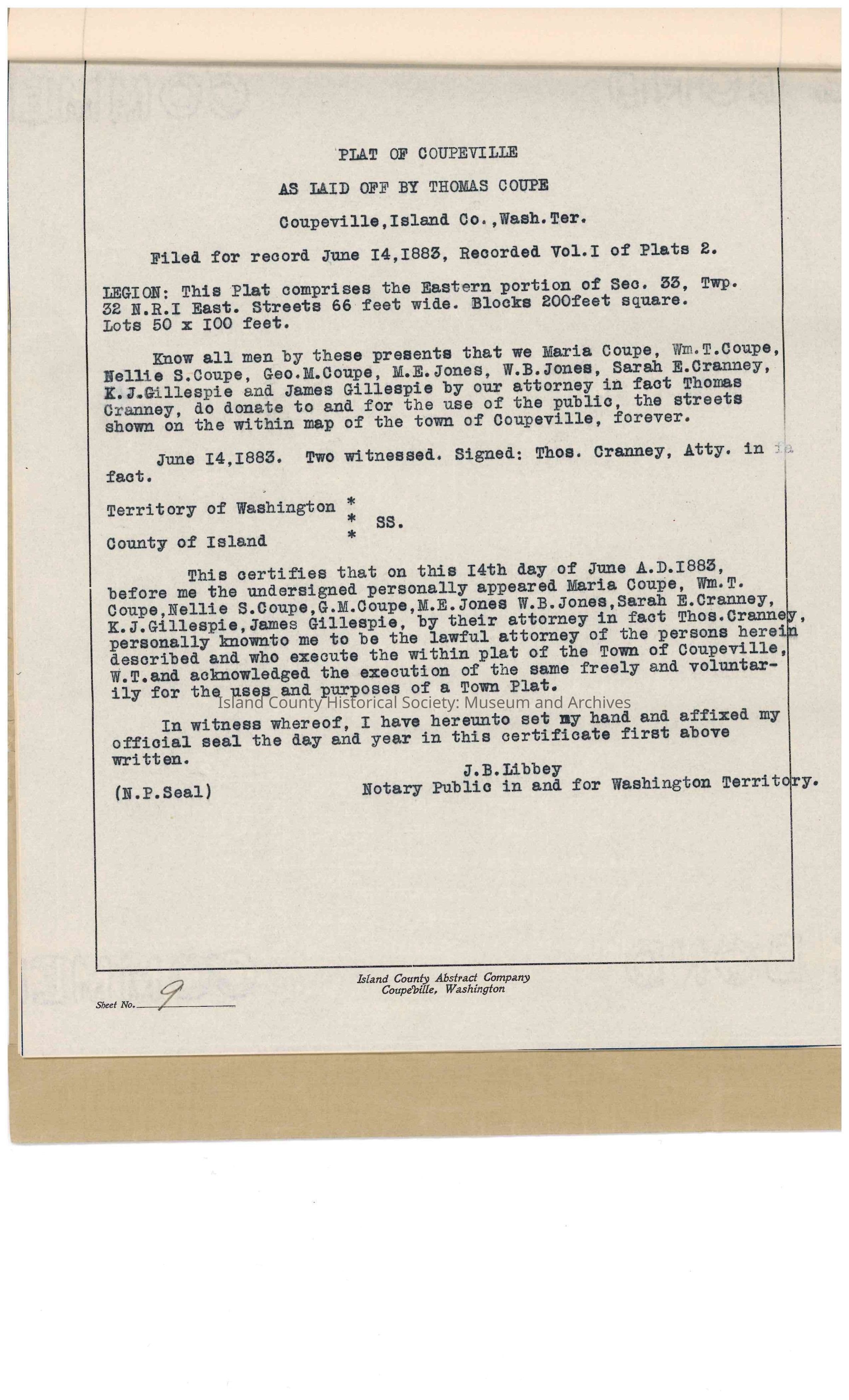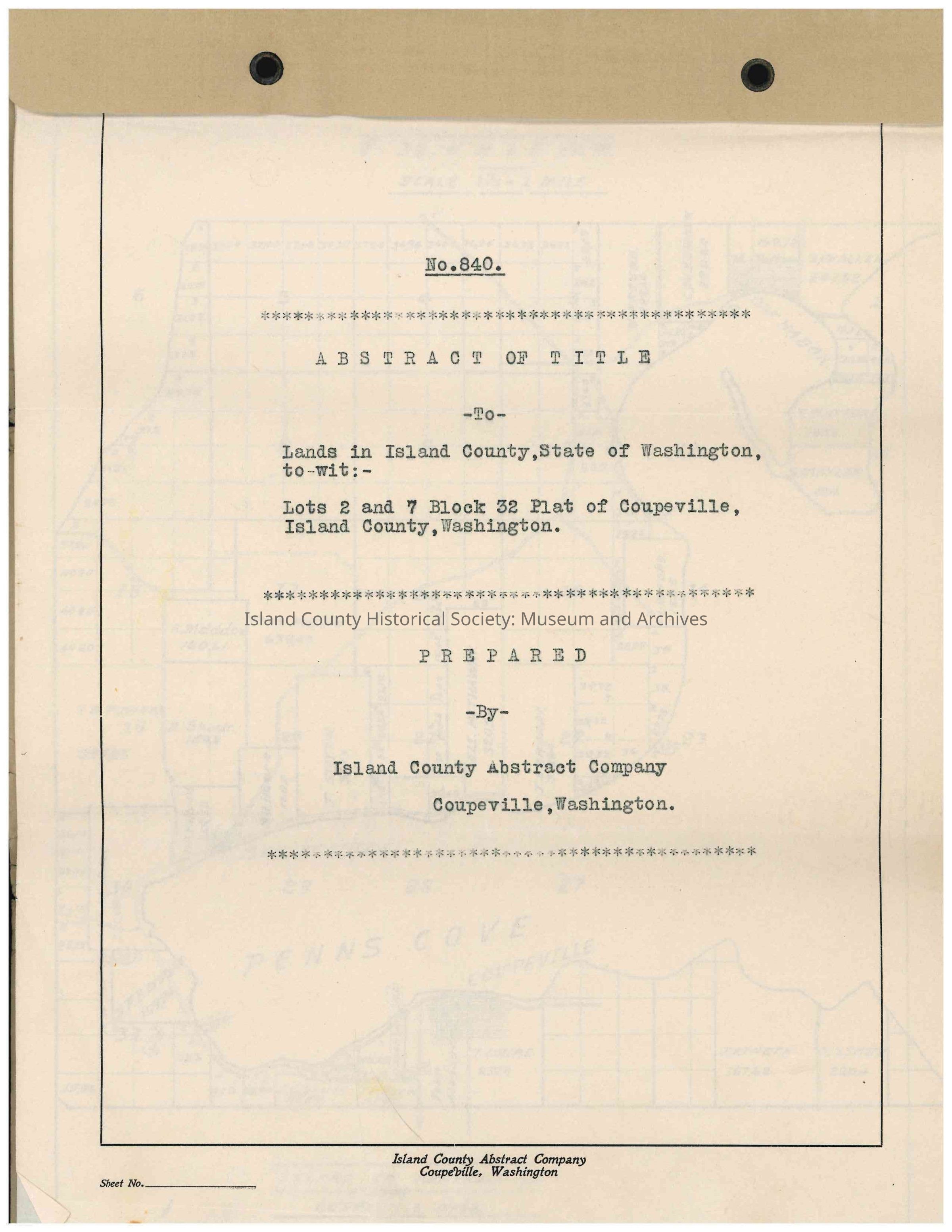 Abstract of Title for "Lots 2 and 7 Block 32 Plat of Coupeville, Island County, Washington." Dated from 1853 to 1920.