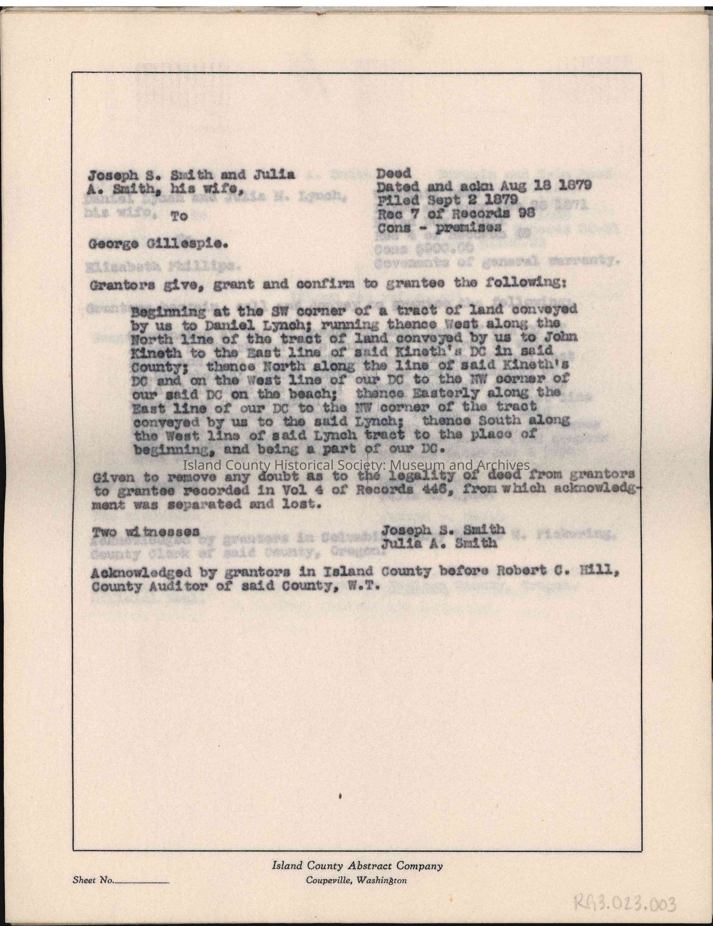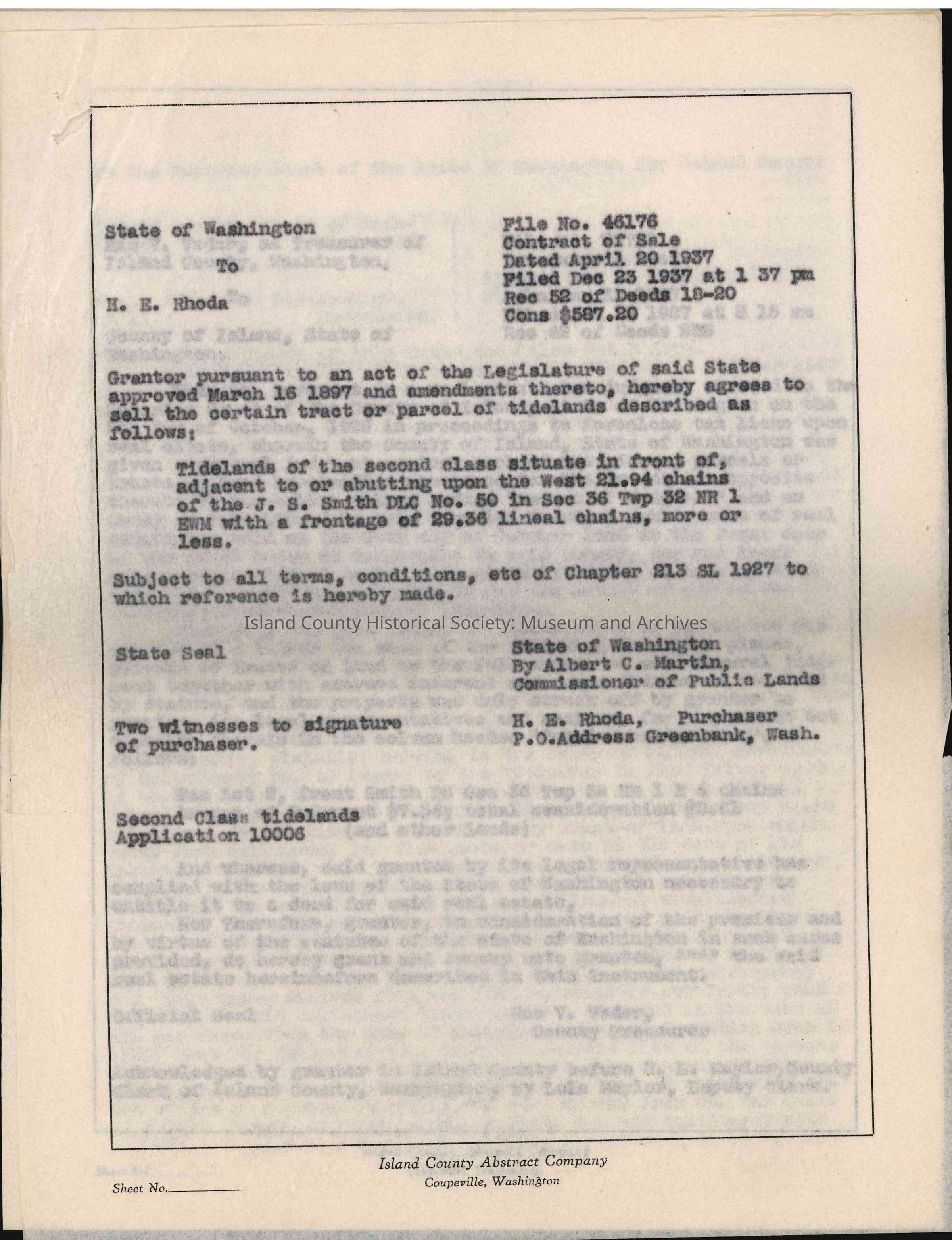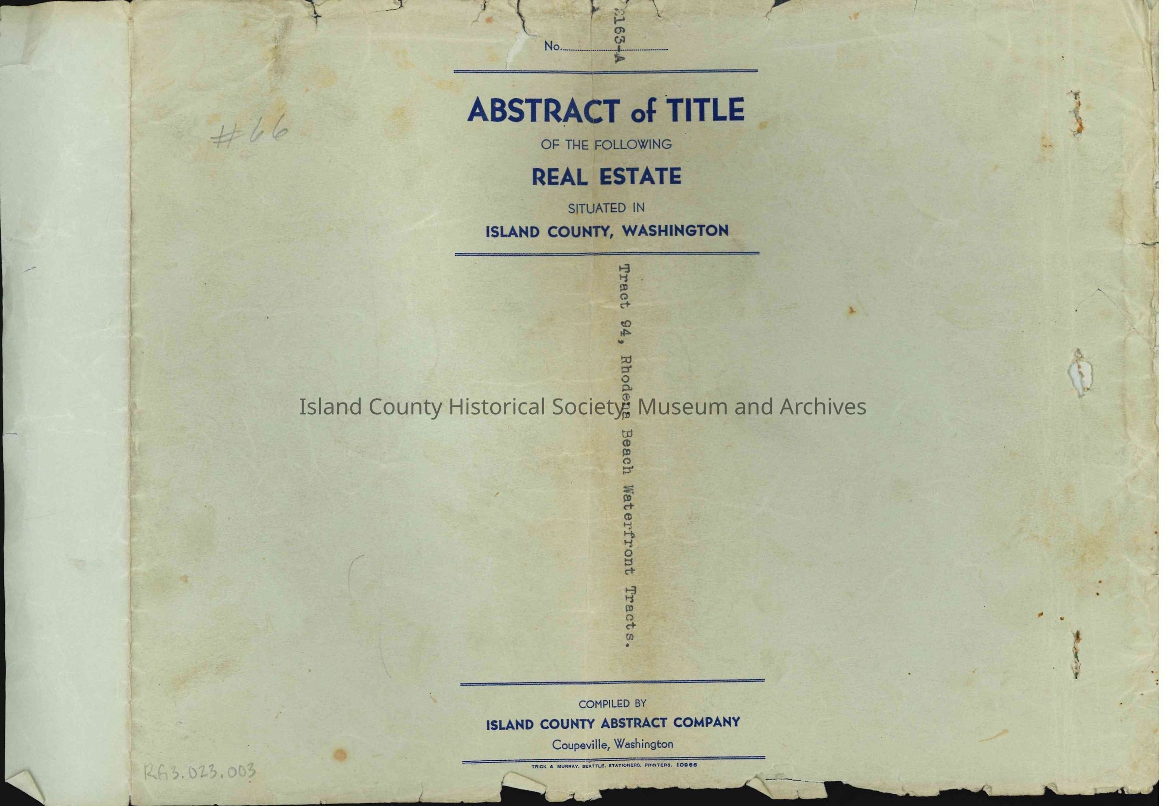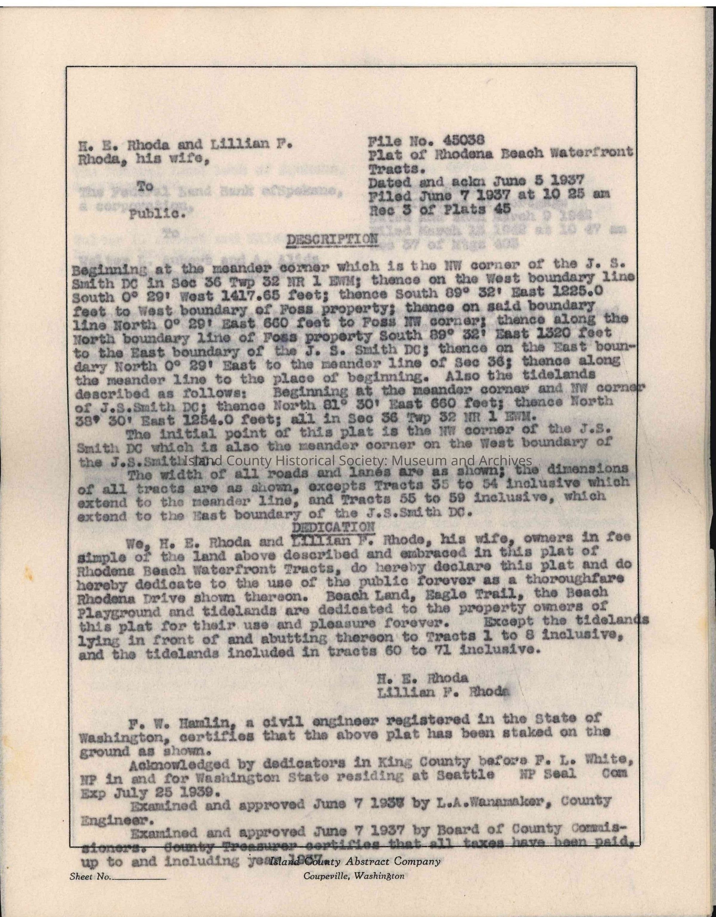 This Abstract of Title contains bargain and sale deeds, quitclaim deeds, mortgages, deeds, warranty deeds, legal and court filings of H. E. Rhoda and Lillian Rhoda [plaintiffs] vs. Island County [defendants], legal and court filings in the matter of the estate of James Gillespie, legal and court filings of James Gillespie [plaintiff] vs. Harry C. Stokes [defendant], patents, contracts, affidavits, plat descriptions (specifically Rhodena Beach Waterfront Tracts), legal and court filings of W. L. Aubert [plaintiff] vs. Margaret E. M. Aubert [defendant], treasurer's deed, tideland deed, and more.