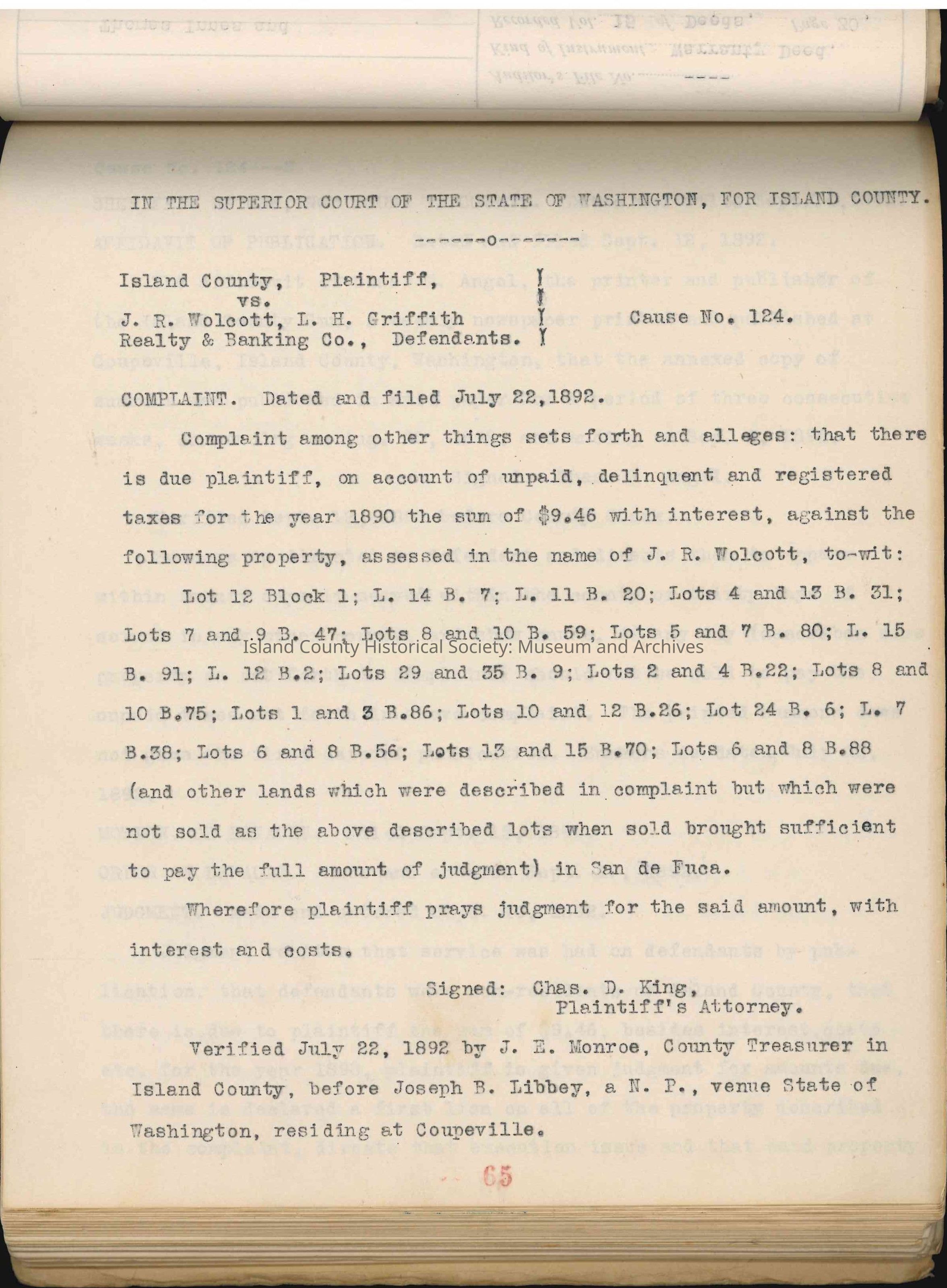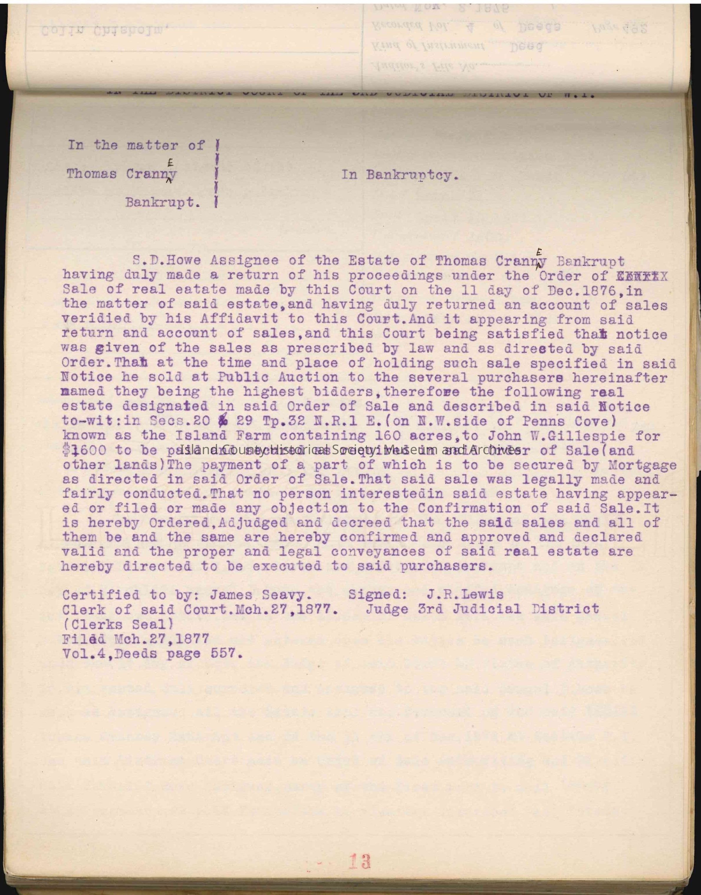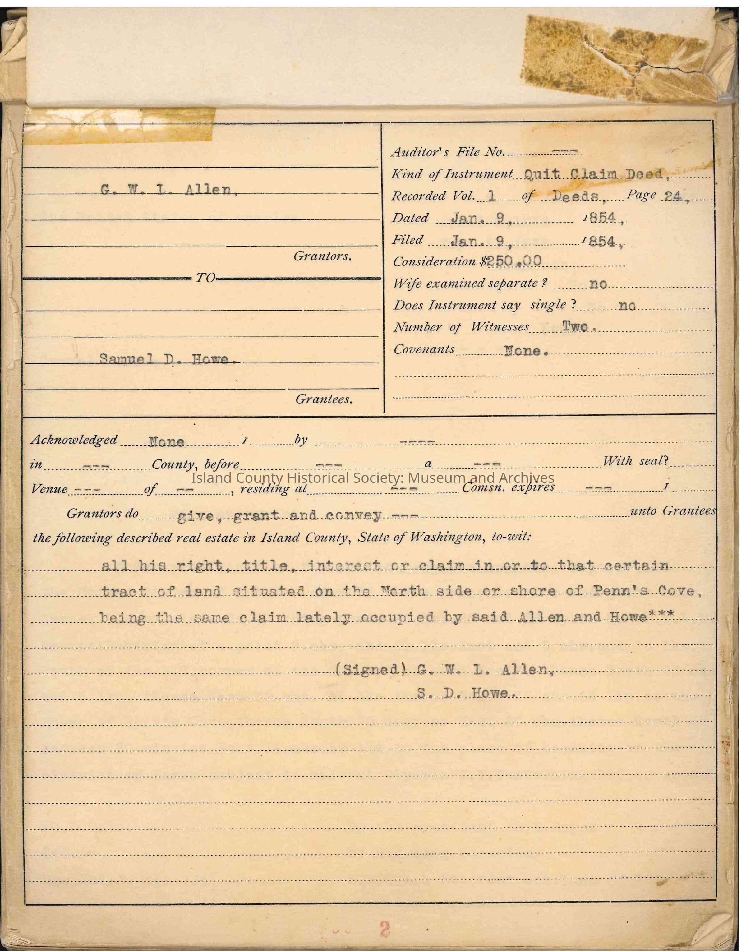 This Abstract of Title contains maps, quit claim deeds, U.S. Patents (Donation Land Claims), warranty deeds, affidavits, mortgages, contracts, assignment of mortgages, bankruptcy filings, assignee deeds, power of attorney contracts, bond for deeds, legal complaints (Island County vs. various defendants), sheriff's deeds, treasurer's tax deeds, application for judgement (legal filings: John Benson vs. F. F. Cleveland); (foreclosing of tax liens for Island County), and more.