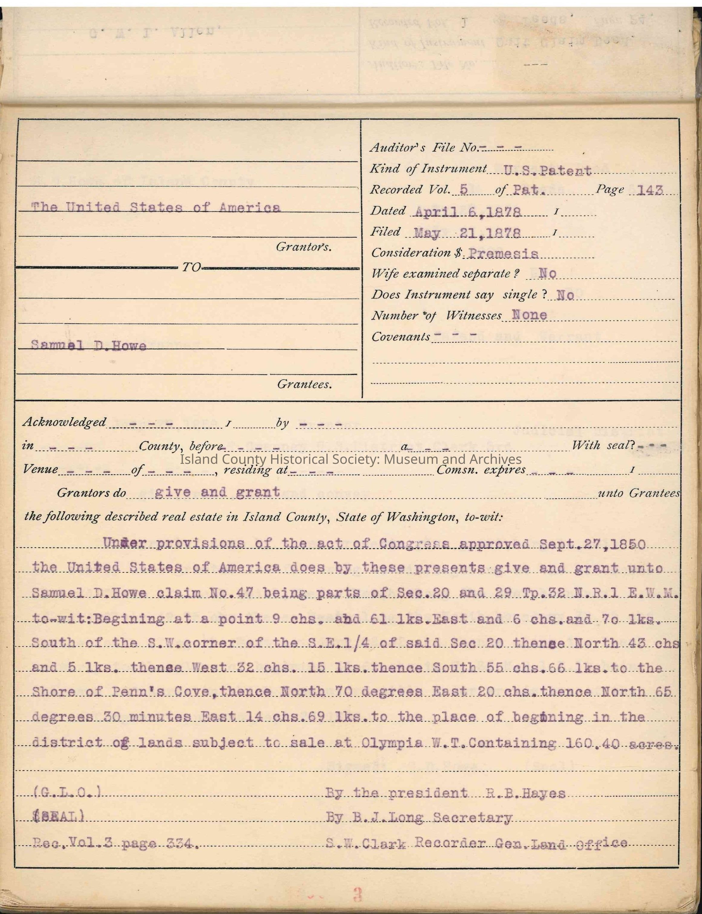 The first patent record for this portion of land is attributed to Samuel D. Howe, dated 1878.