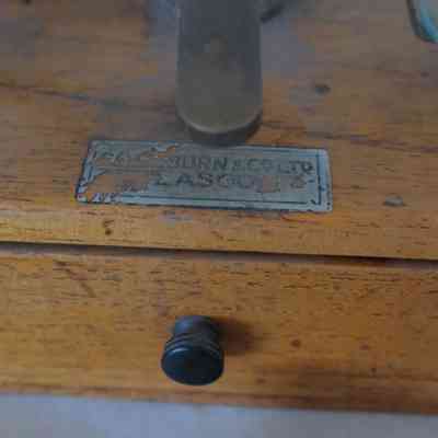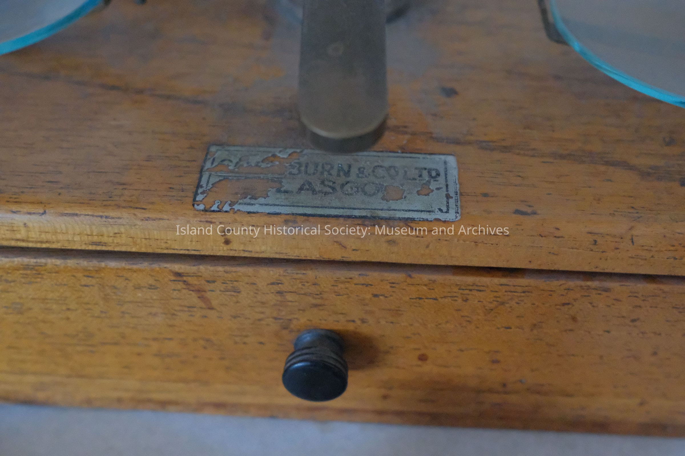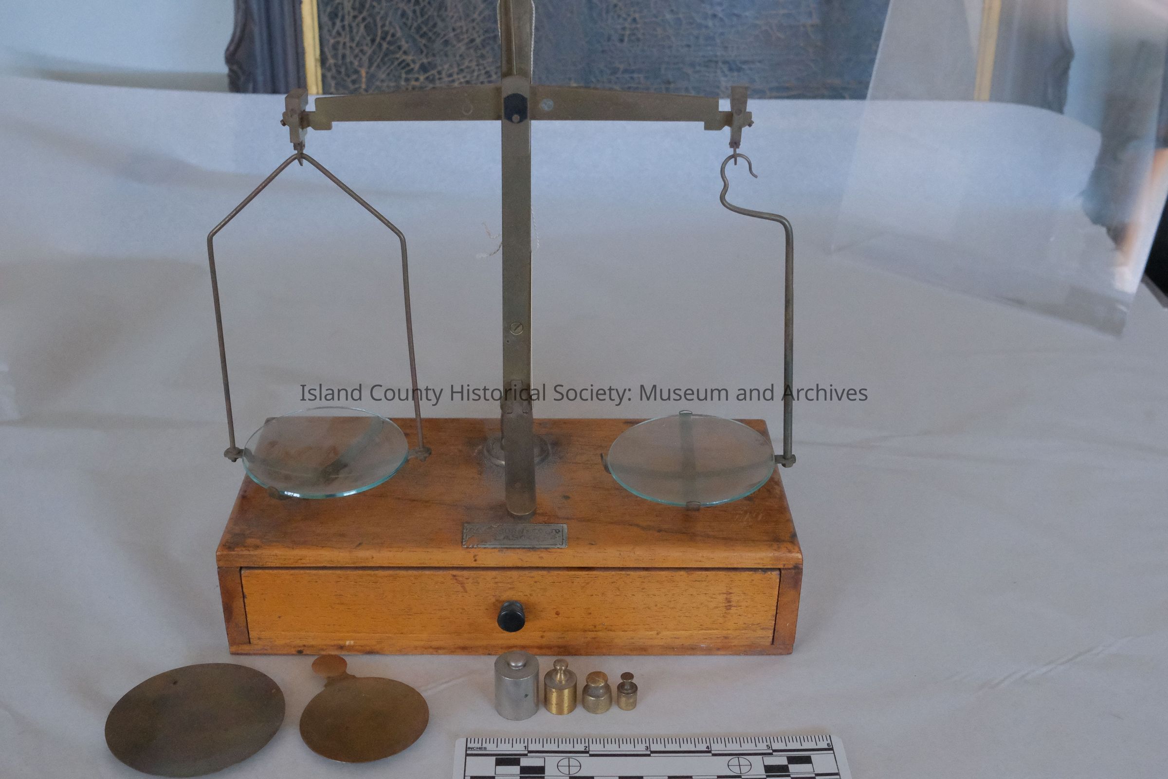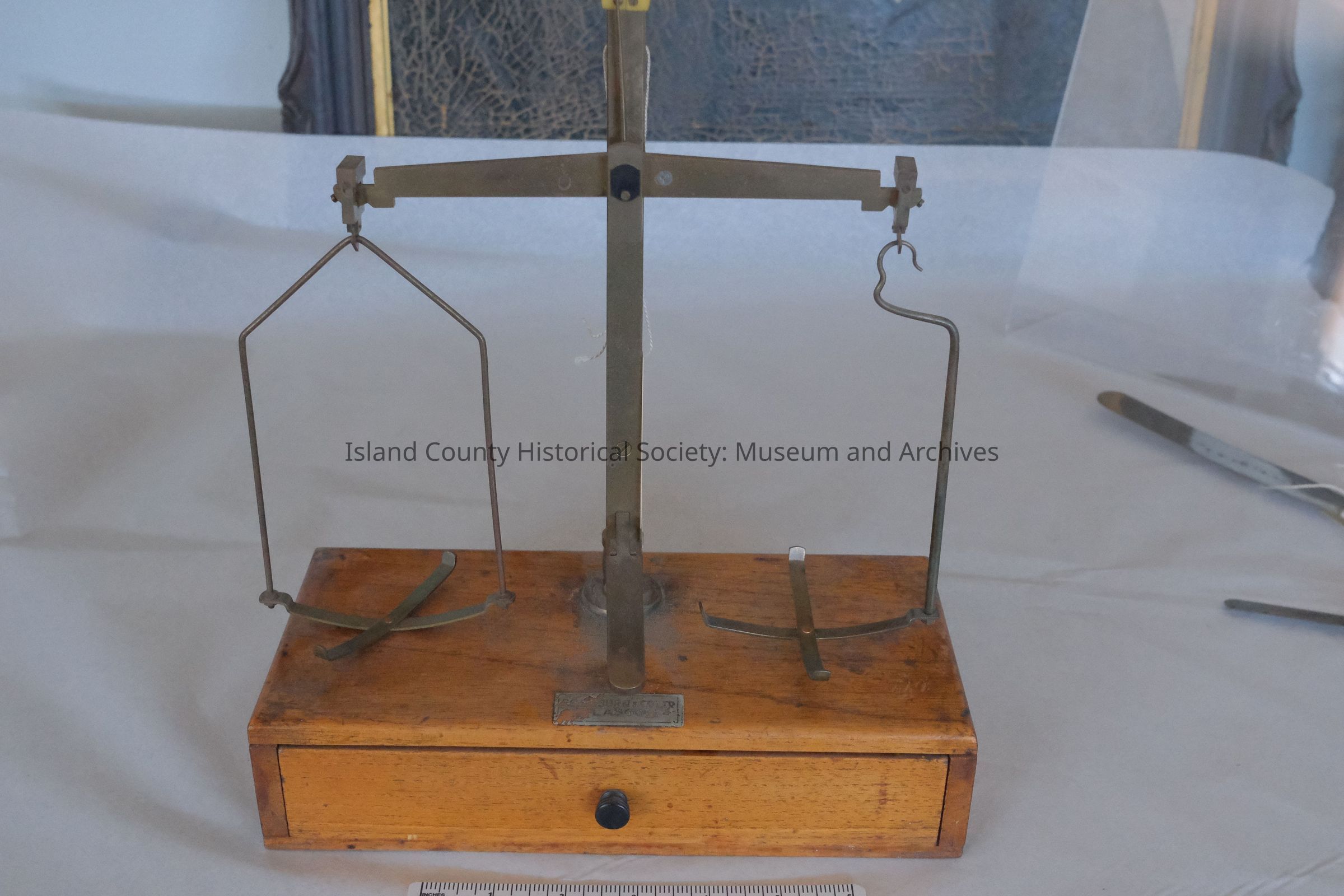 An apothecary scale used by Elwin Blair. Part of label is missing [Washburn?] & Co. Ltd. Glasgow.