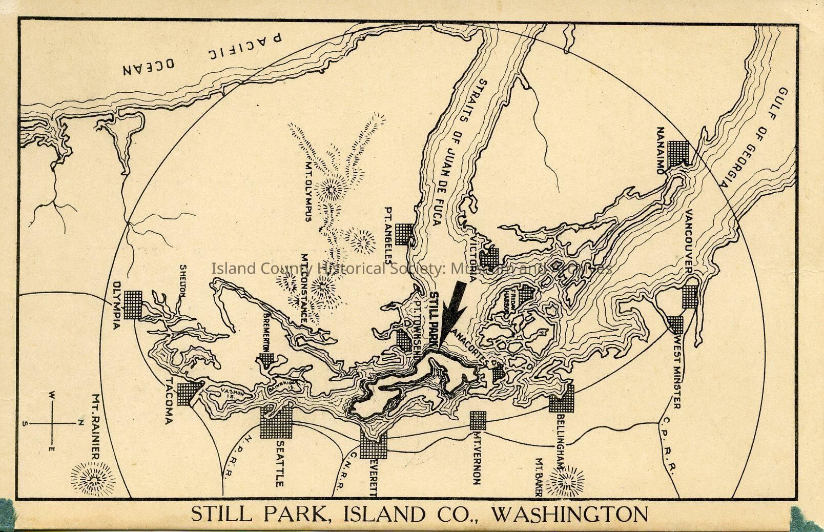 One in a collection of Souvenir Post Cards of Still Park (9). Card is an ink drawing of Puget Sound map with the title, STILL PARK, ISLAND CO., WASHINGTON. A bold arrow points to Still Park on Whidbey Island. The map includes Whidbey Island, the San Juan Islands and part of Vancouver Island. It extends south as far as Mt. Ranier.
