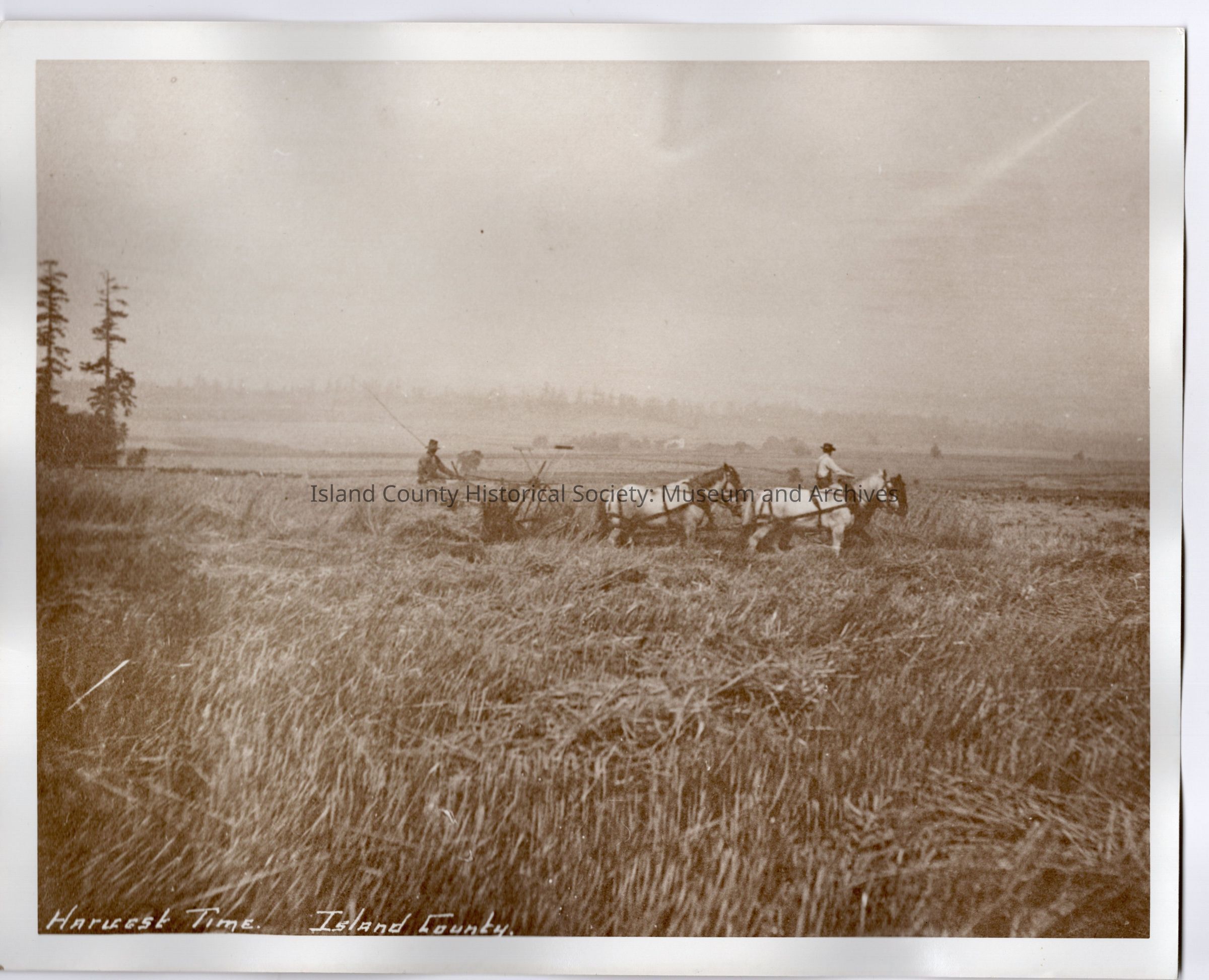 Harvest Time in Island County - undated Farmers use a threshing machine to harvest hay