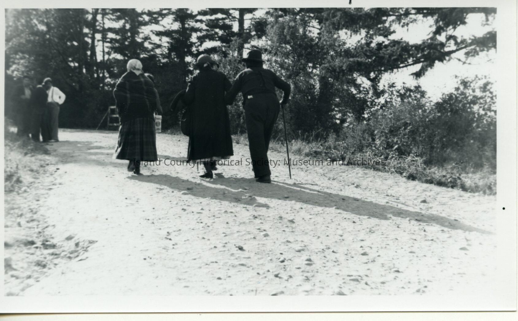Black and white photo showing the backs of three people, two women and one man, walking up a hill towards a few men congregated towards the top. They ascend a path of stone and gravel with bushes and trees along both sides. The women are bundled up warmly, one holding a cane. The man also has a cane and holds onto the woman next to him.Collection
