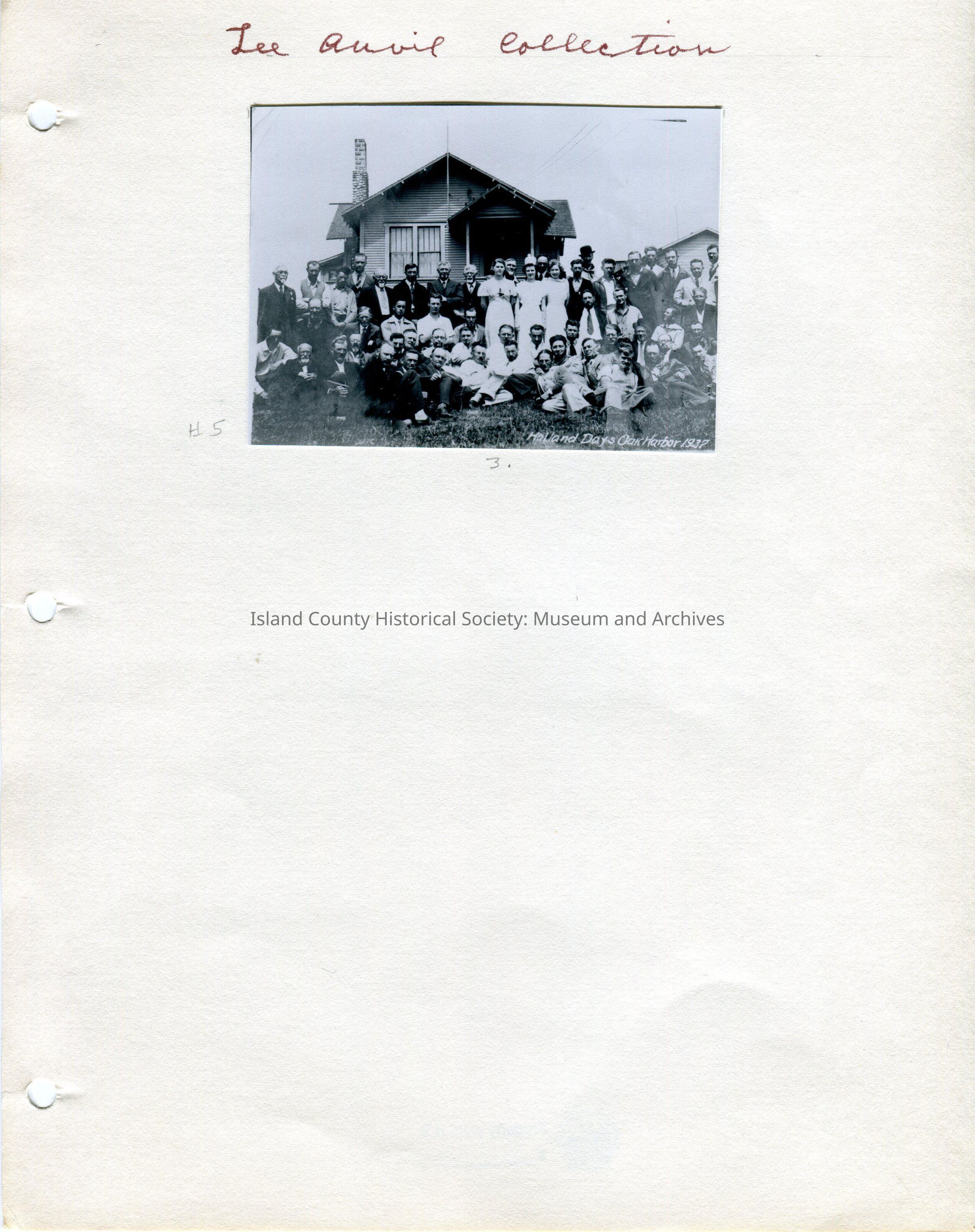 Top Photo - 4"W x 3"H - - photo of a large group of men standing/sitting on a lawn in front of a house. In the middle of the group are three young women wearing long white dresses. Printed on the photo in the lower right corner: "Holland Days, Oak Harbor 1937."