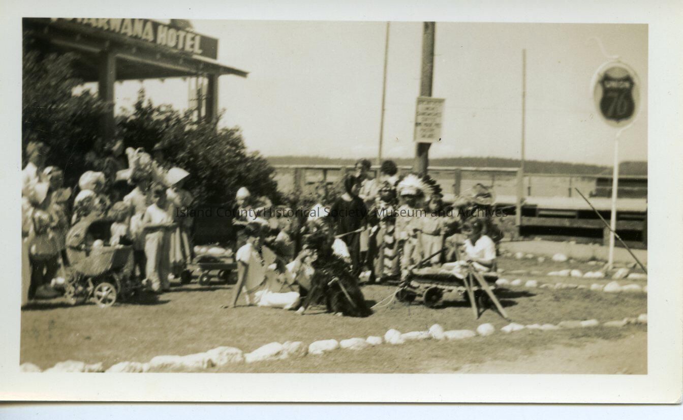 Black and white photo showing group of people in front of the Starwanna Hotel with black dog. Blurred image. Mostly children who sit or stand along the road side. A Native American man and one or two Native American children are in full ceremonial dress. A signpost along the street: Union 76.