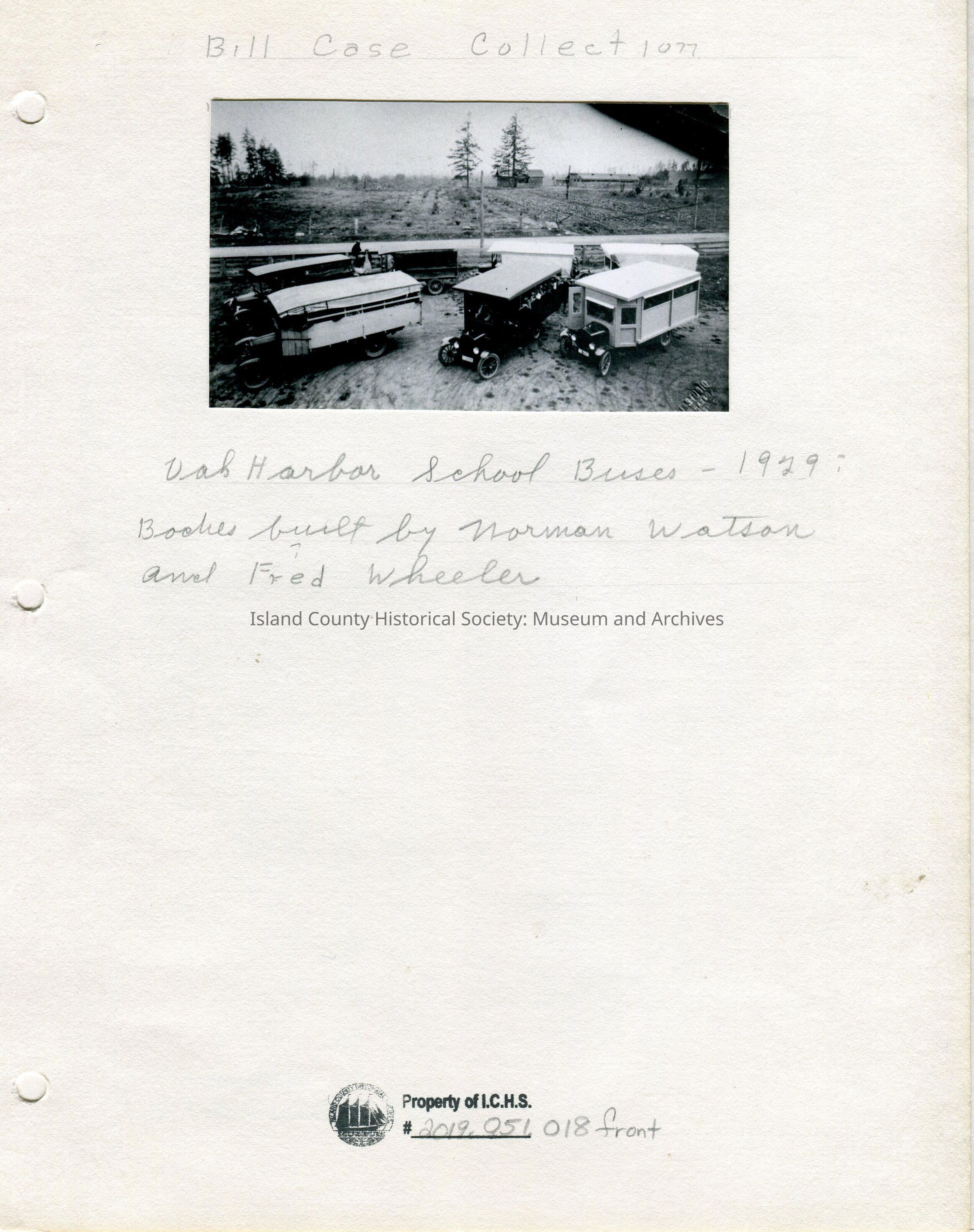 Top Photo - 4.5"W x 2.75"H - photo of seven Oak Harbor School buses in 1929. The buses are parked on a dirt lot with a field and barn in the background. Written underneath the picture: "Bodies (sp.) built by Norman Watson and Fred Wheeler.