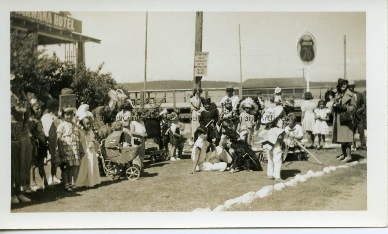 Black and white negative of group congregated outside the Starwana Hotel during a water festival event (1930s?). Mostly children, some dressed up (one boy wears a sombrero and serape) . One boy sits on the grass with a black dog. Two Native American boys behind the dog are in full ceremonial garb. A Union 76 signpost stands to the right of the photo. The wharf is in the background.