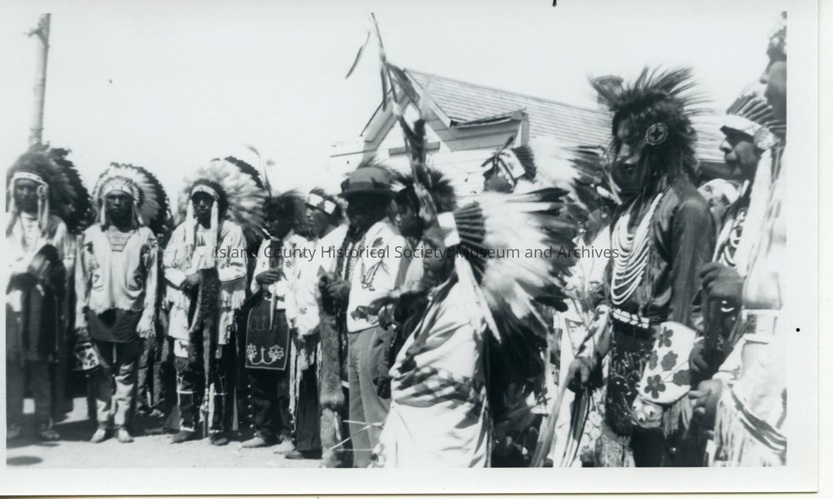Black and white photo of Native American men standing in a circle of semi-circle dressed in ceremonial garb during a water festival event. They all appear to be young. The man wearing a 1930s hat standing in the middle of the photo holds something either covered in animal hide or is a part of an animal with what looks like a few arrows stuck in the end.