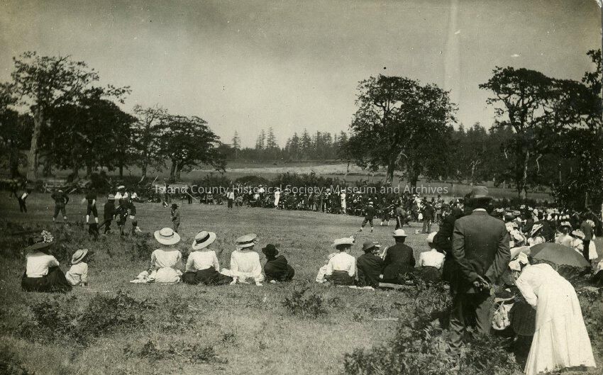 Spectators watching a baseball game, place and teams unidentified, likely Oak Harbor among the Garry Oaks.