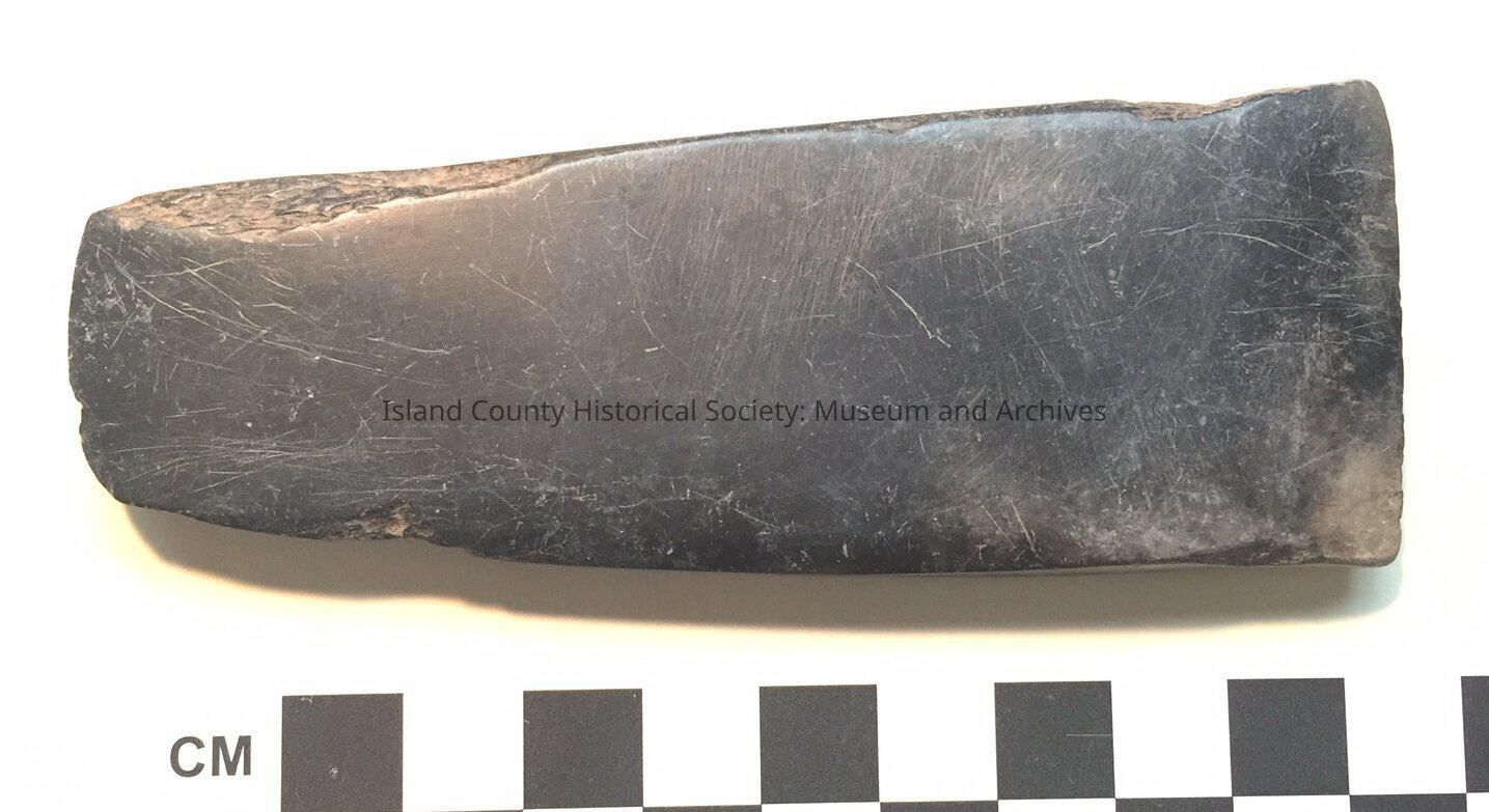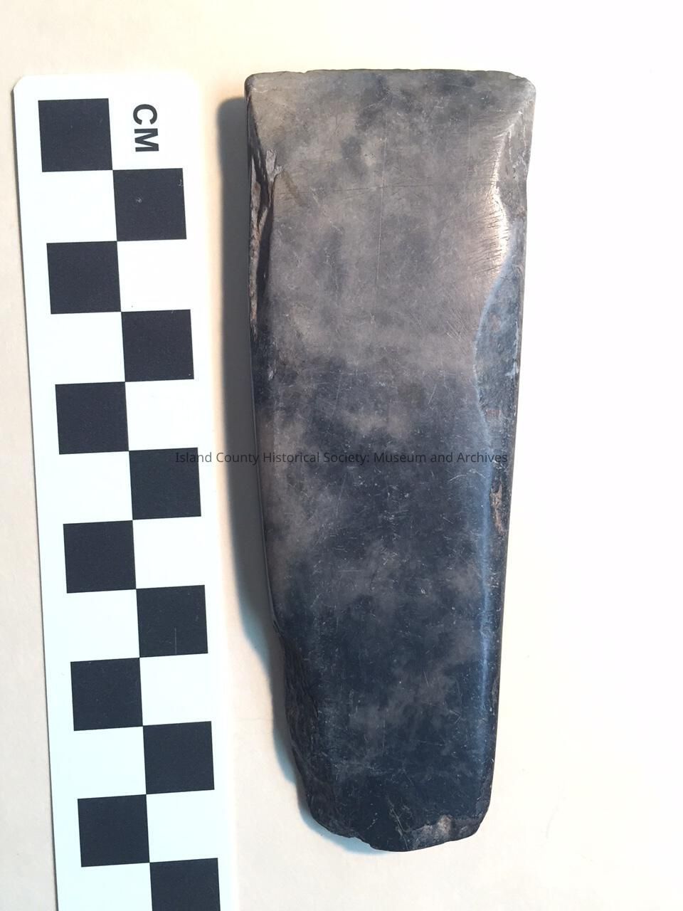 Stone adz, dark grey. Smoothed on all side - except one end & section of both edged damaged & chipped but still appears smoothed over damaged areas.
