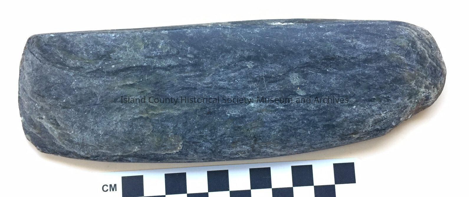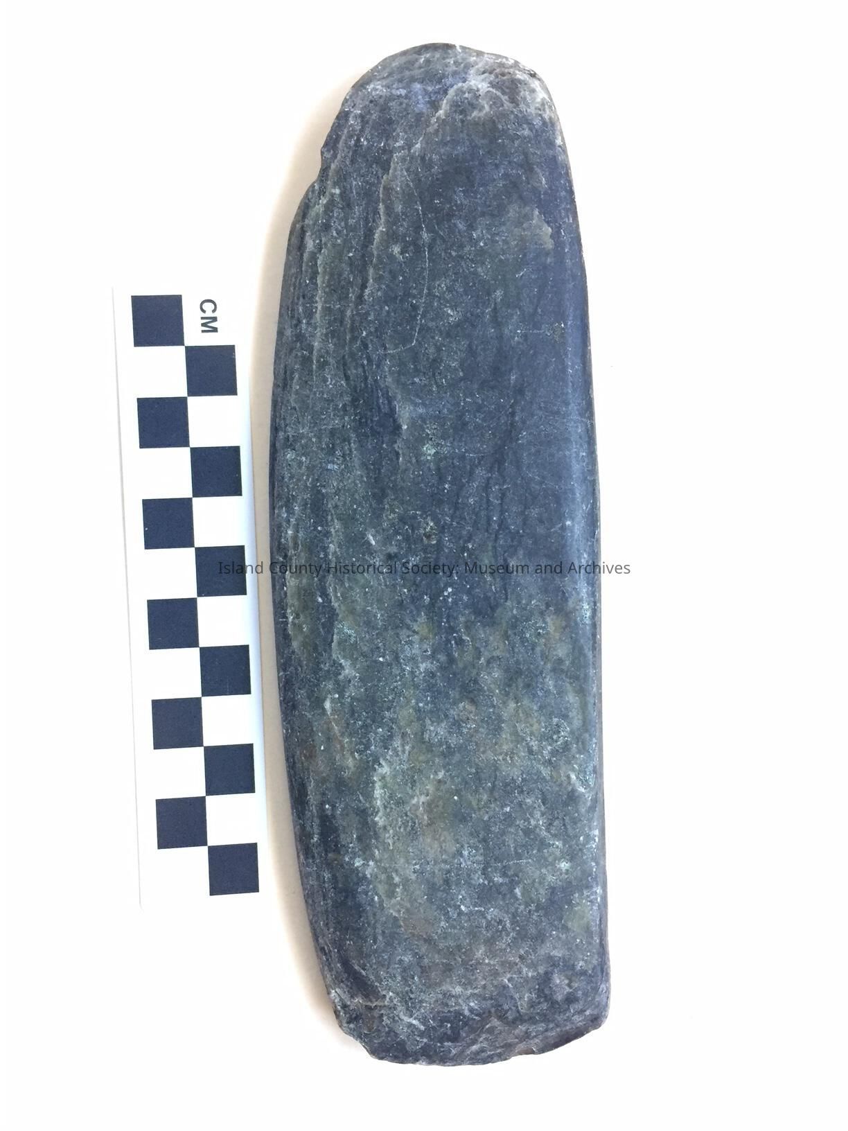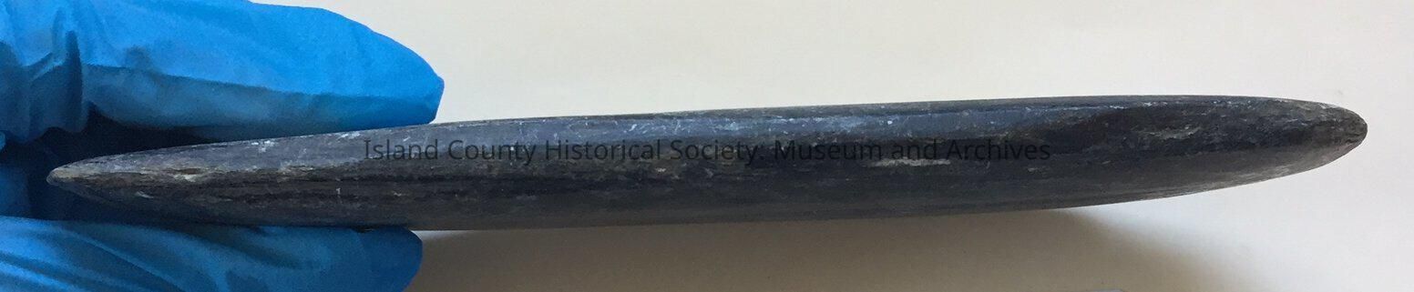 Stone adz, dark grey in color. Smoothed on all edges and both sides. Tappered on both ends, both having some chipping damage.