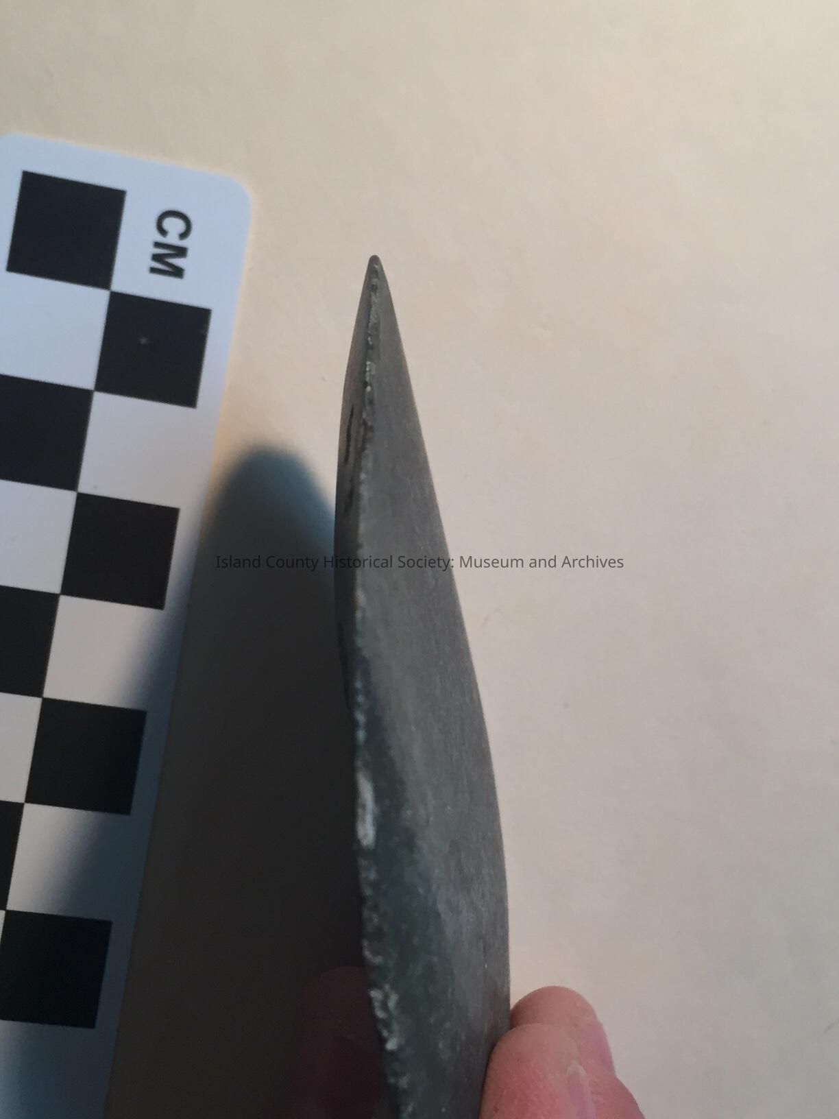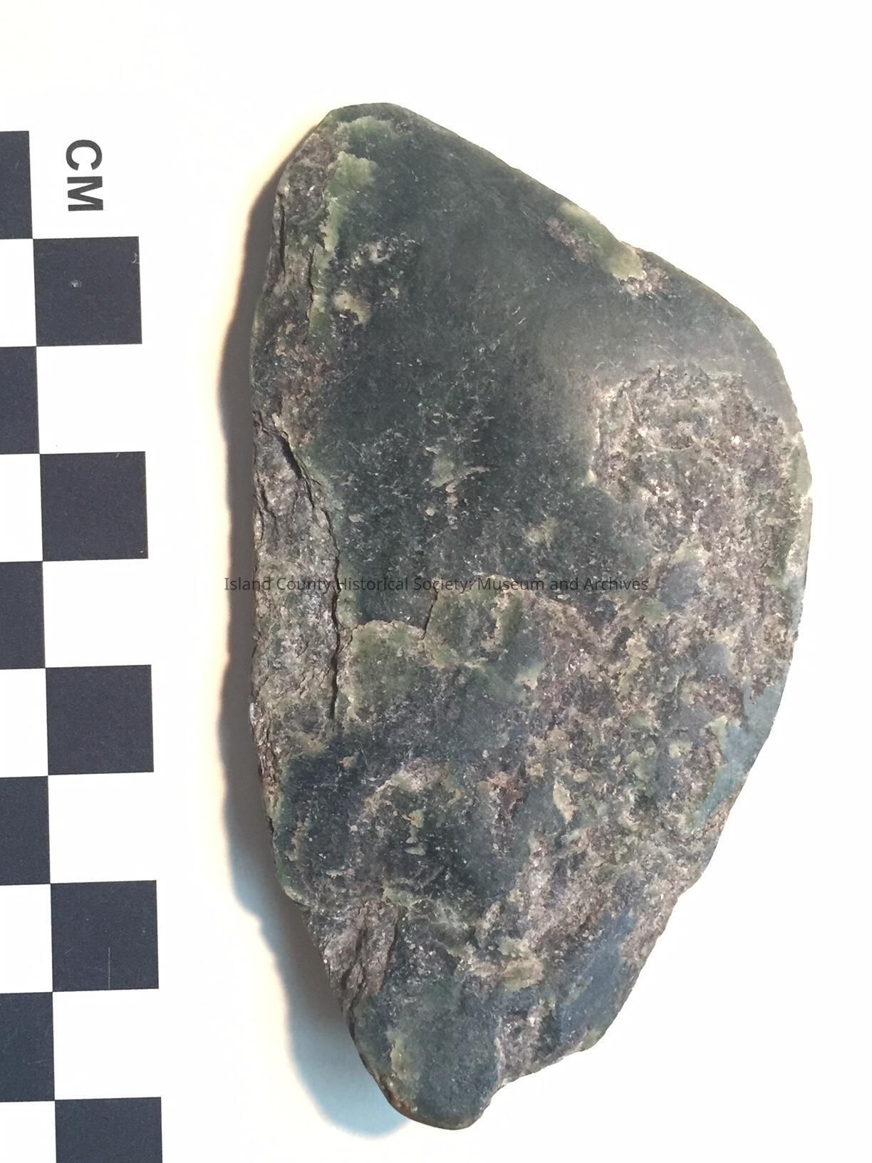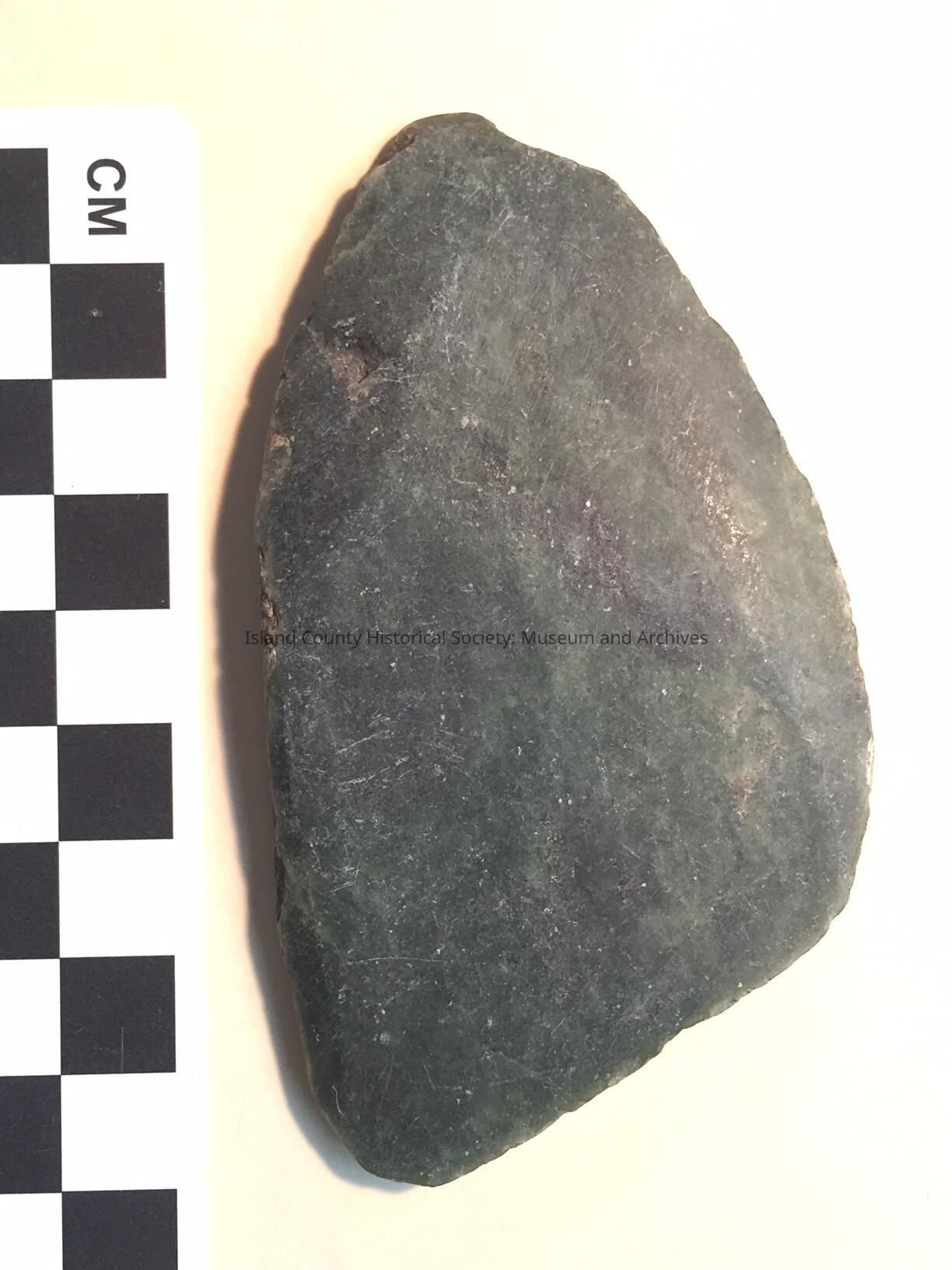Stone adz, dark greenish tone. Smoothed in full on one side. Otherside irregular but also smoothed in some areas.