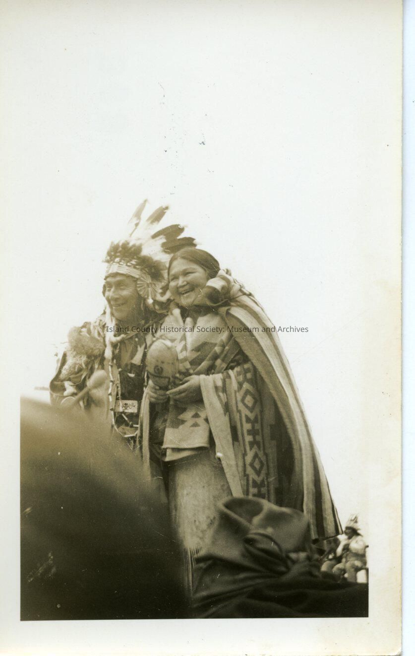 Black and white photograph of a Native American couple, man and woman, on a platform, during a water festival event. They are in ceremonial dress and holding musical instruments. They both smile at the unseen audience. A blurry view of someone's head crowds part of the foreground.