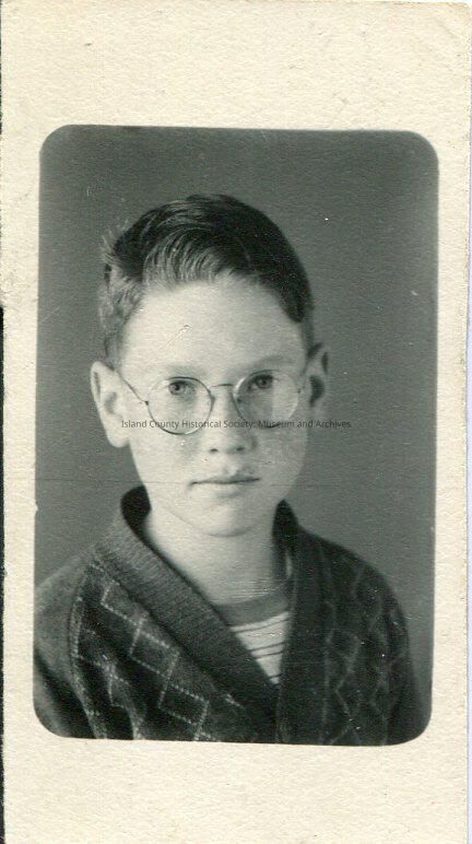 Black & white school picture of a young, freckled-faced boy with round glasses wearing a diamond patterned sweater over a tee-shirt. On the back is written, " Ron Van Dyk 12 yo?".