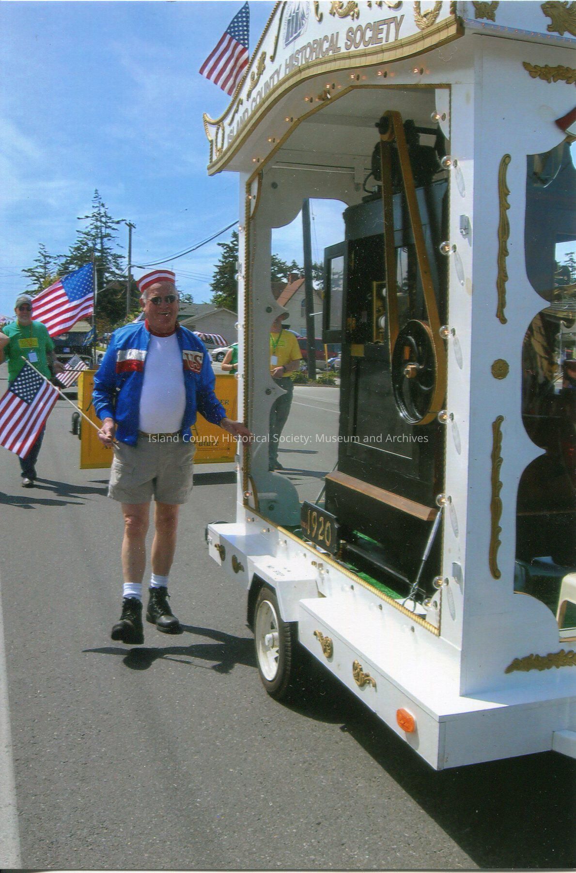Color photo of Ron Van Dyk standing next to the Island County Historical Society float during a parade. He is dressed in tan shorts, white tee-shirt, and blue jacket. He is holding a U.S. flag and wearing sunglasses and a red & white striped cap. No description or date.