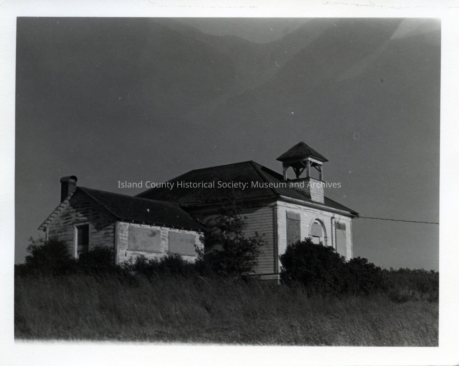 Building with bell tower and addition. Windows are boarded up and vegetation overgrown. Paint is peeling. Schoolhouse 1895 - Coveland Dist. #1.