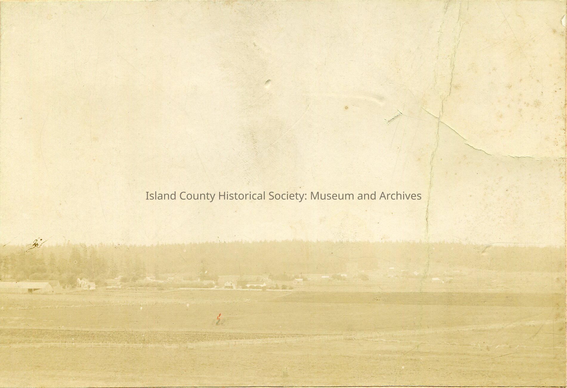 Black and white photo mounted on cardboard frame. The photo is of farmland with houses in the distance. The photo is very faded. No description or date. On the back of the cardboard mount, there are a variety of names and measurements that appear to be unrelated to the picture.