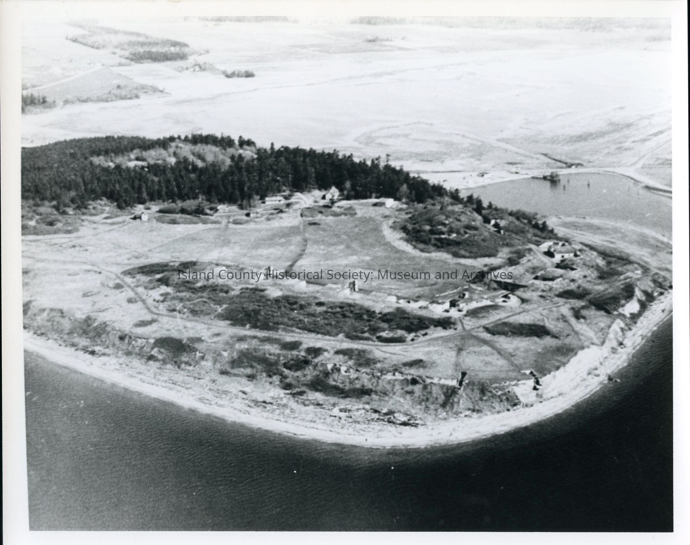 Photograph showing an aerial view of Fort Casey, c. 1960. Photo possibly by Steve Koblyk.Photograph Details
