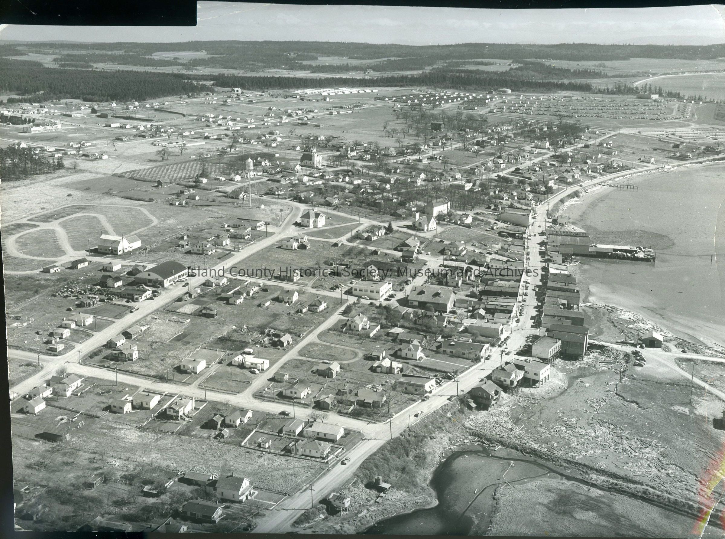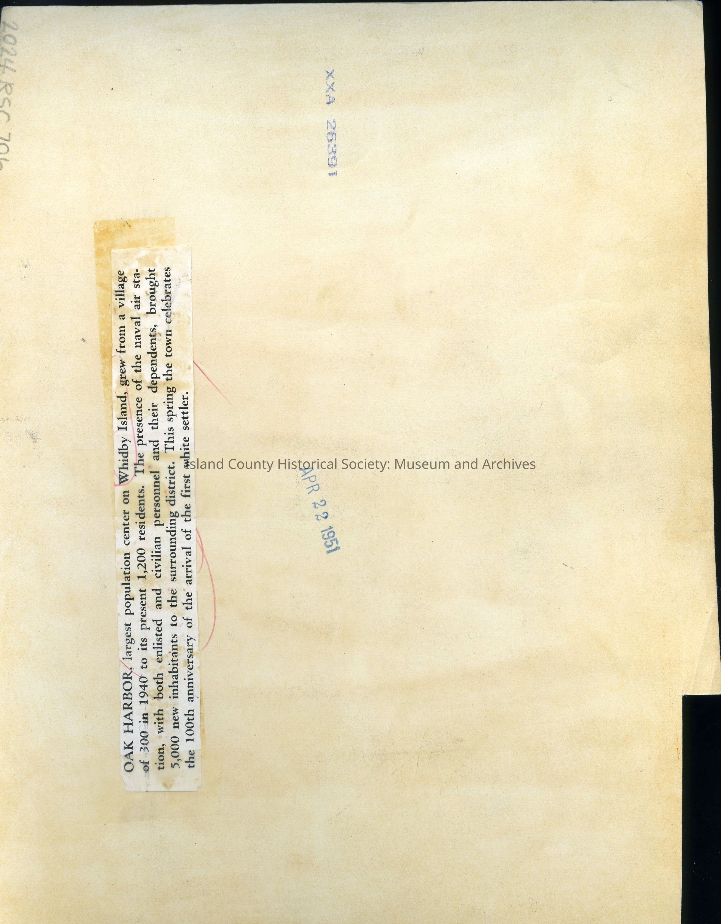 Photograph showing an aerial view of Oak Harbor and a portion of its waterfront, c. 1940-1951. There is a short informative and dated clipping pasted on the reverse of the photo which describes Oak Harbor and its population briefly.Photograph Details