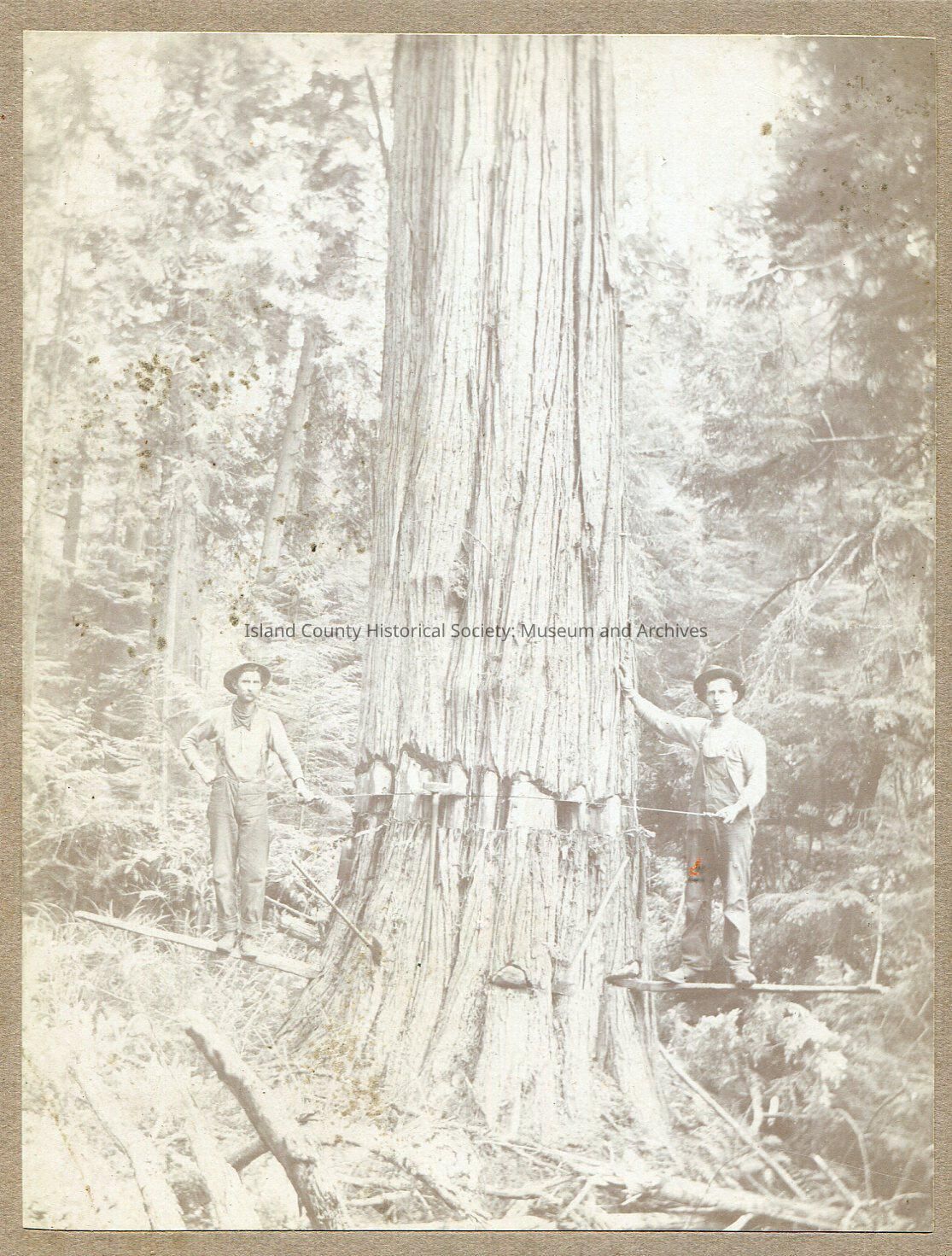 Black and white photo mounted on cardboard frame. The photo is of a logging operation in a forest. Two loggers are standing on either side of a large tree that they are in the process of felling. They are standing on springboards holding either end of a two-man logging crosscut saw. No description or date.