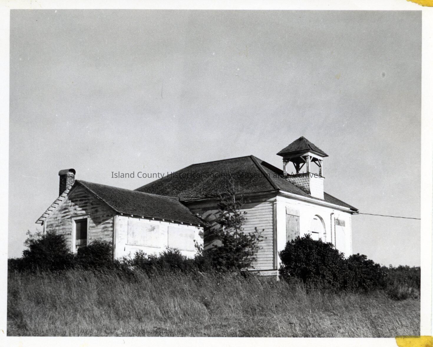 Building with bell tower and addition. Windows are boarded up and vegetation overgrown. Paint is peeling. Second schoolhouse built at San de Fuca for School District #1 - 1895.