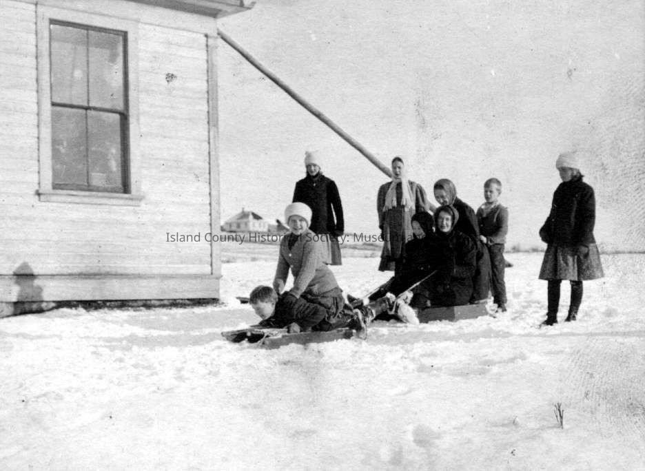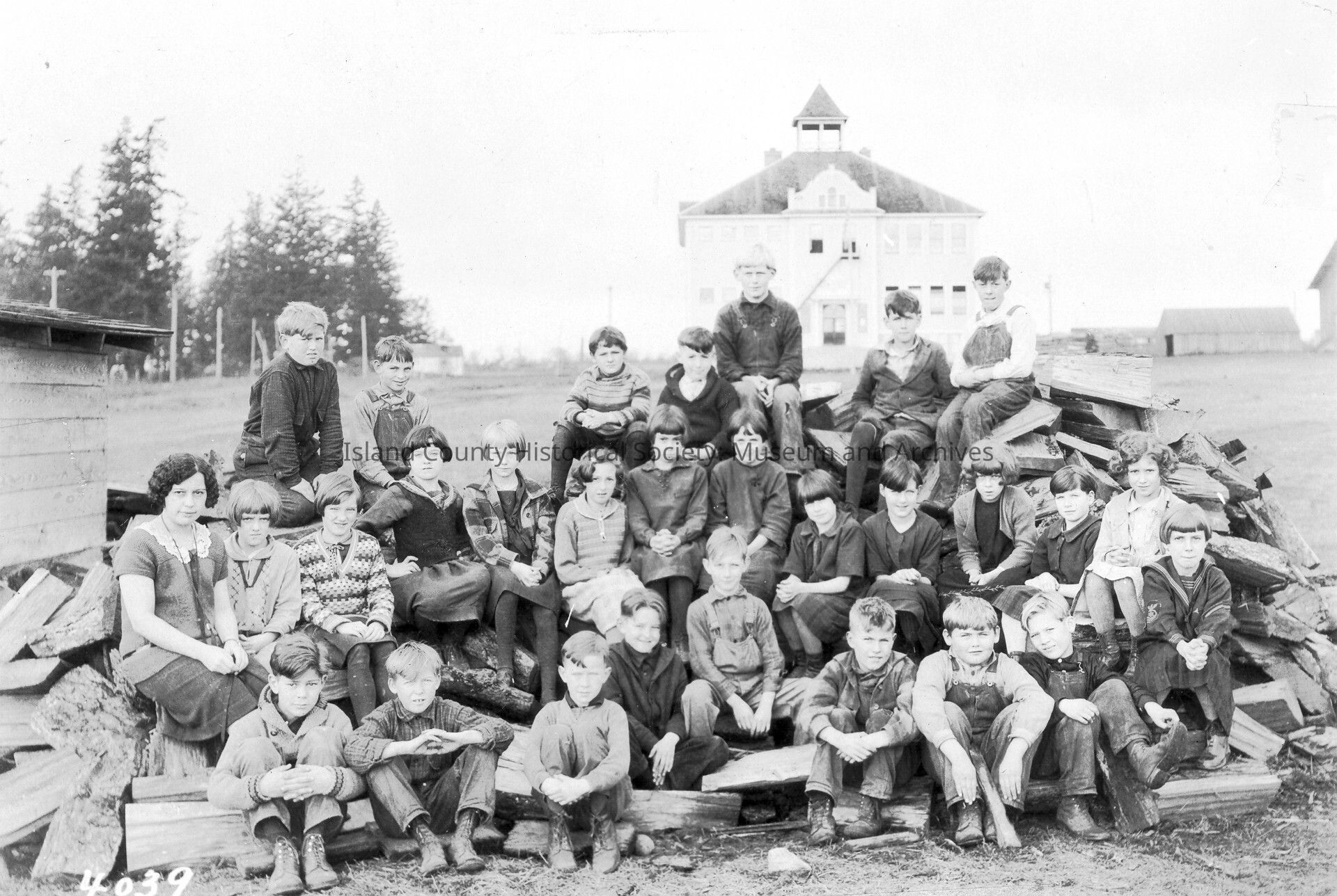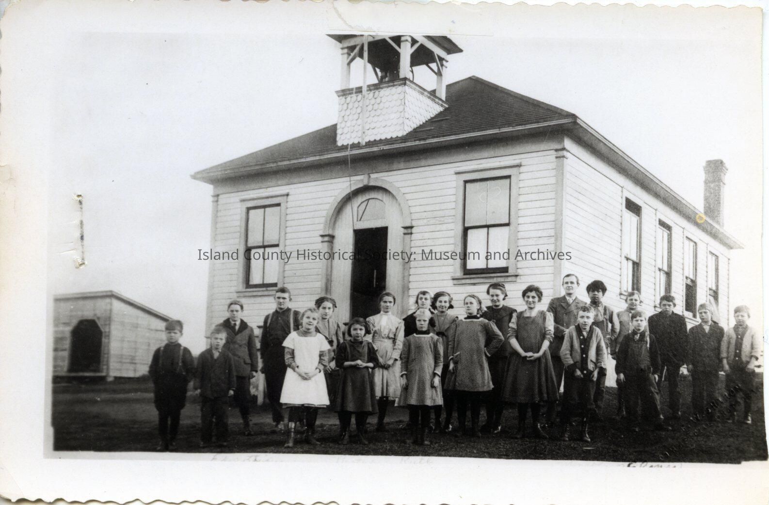 Children with teachers standing outside San de Fuca school. Prior to addition, a small shed stands on left. Milton McArther, Olive Olsen, Mr. Alfred Perks, Gladys Cobb, Anna Riepma, Gus Stone, Edward Fisher, Grace Riepma, Helen Riepma, Edith Giles, Claud Cobb, Norman Benson, Clara Waltonbaugh, Ruth Olsen, Ida Olsen, Monroe Smith, Nathan Van Dam, Hanford (Pike) Olsen, Bertha Smith, Elmer Grasser, Andrew Olsen, Dale Benson. (Names identified by Andrew Olsen)Lexicon