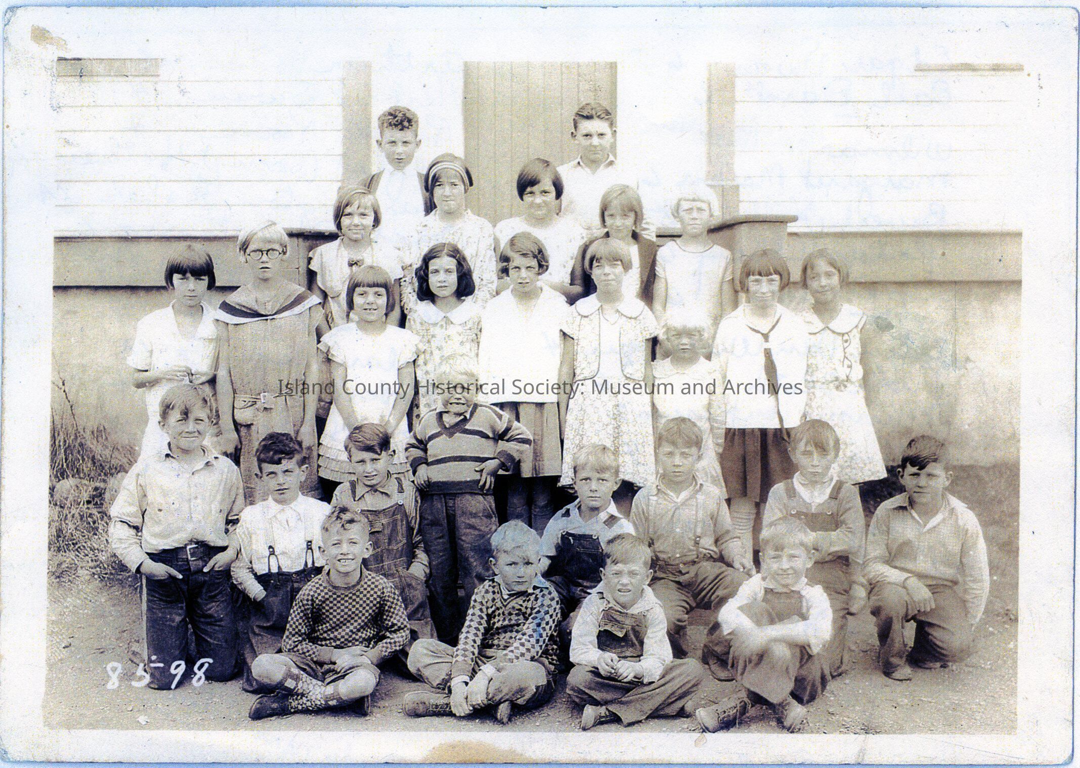 Children standing outside San de Fuca school. Edgar Swan, Earle Darst, Wilma Van Rensun, Margaret Martin, Beverly Williams, Gladys Libbey, Agnes Sloth, Ellen Van Wieringen, Viola Sloth, Minnie Van Rensum, Lillian Dean, Ella Swan, Marjorie Armstrong, Opal Sloth, Dorothy Hingston, June Williams, Arthur Vandervoet, Herbert Swan, Ralph Koorn, Alfred (Sonny) Hathaway, Barrington Fisher, Jack Armstrong, Billy Hingston, Gerald Darst, Orlan Dean, Robert Van Dam, Joe hathaway, Billy Benson. Teacher Mrs. Helen Baker.Lexicon