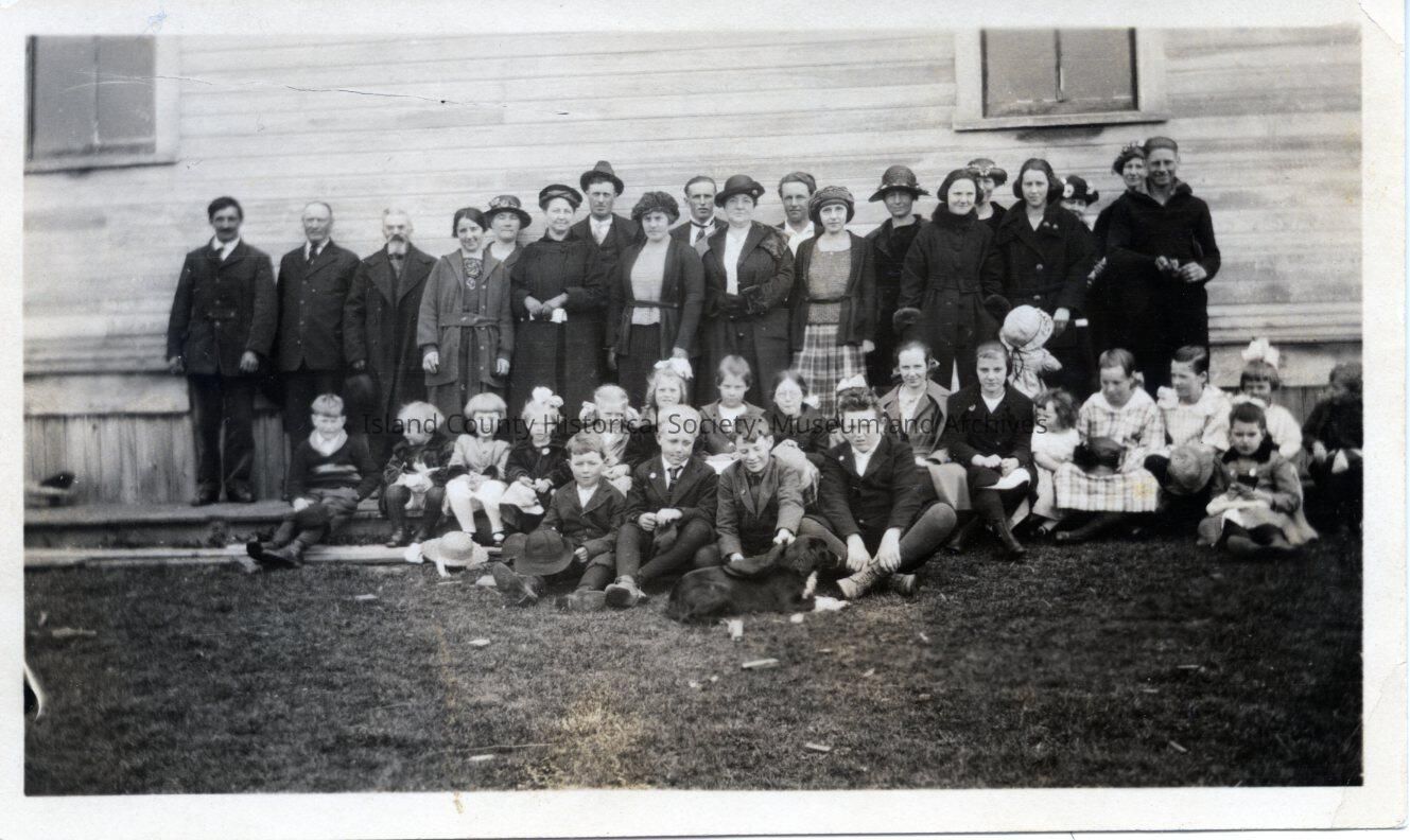 San de Fuca Sunday School. Children sit on ground and adults stand behind in front of a building.