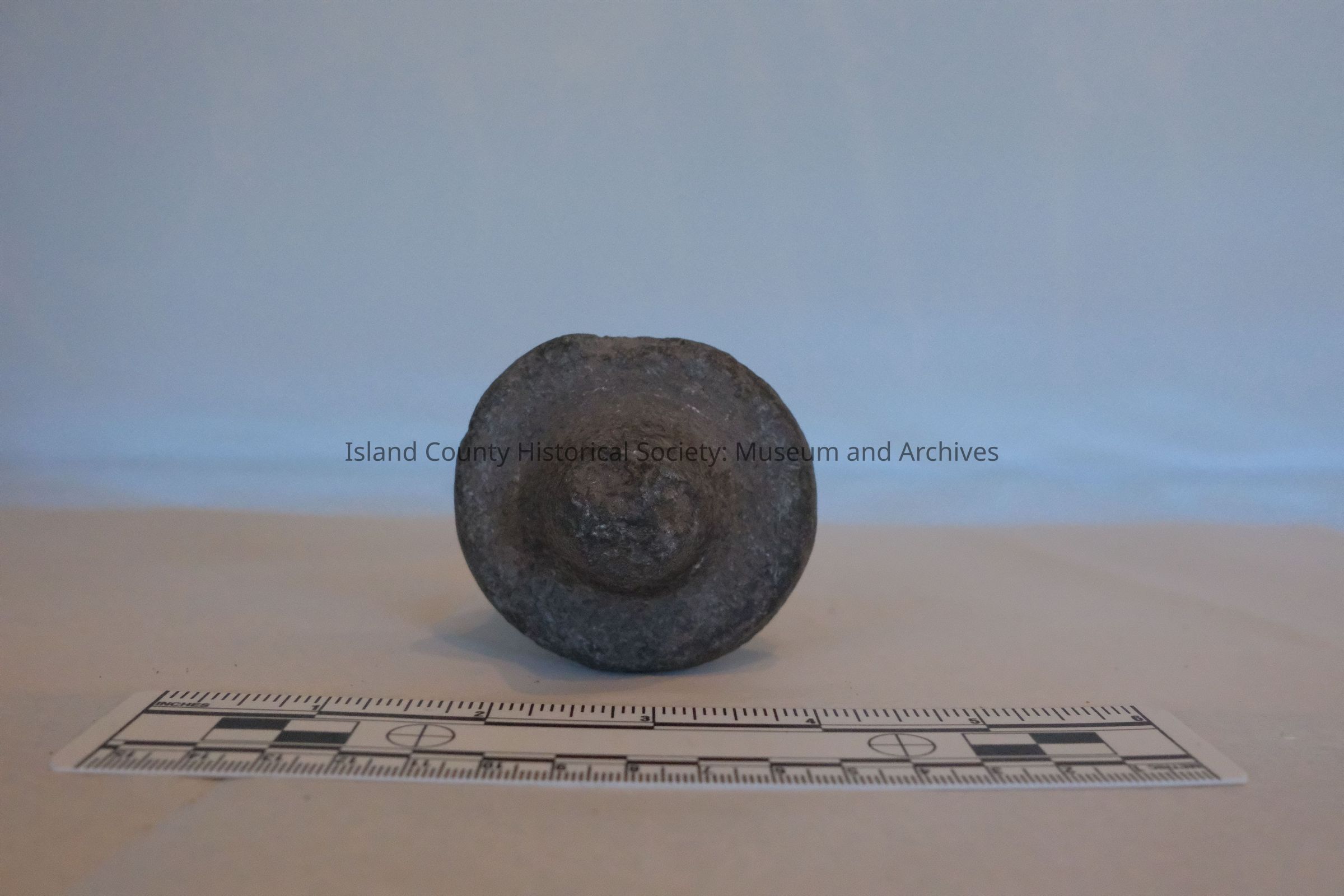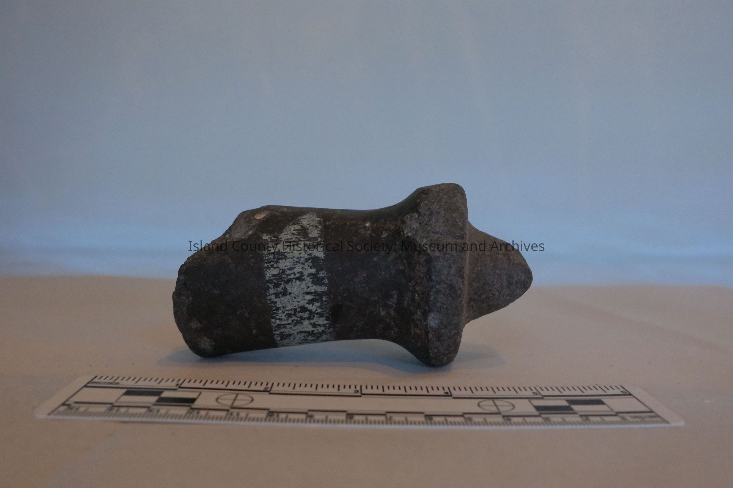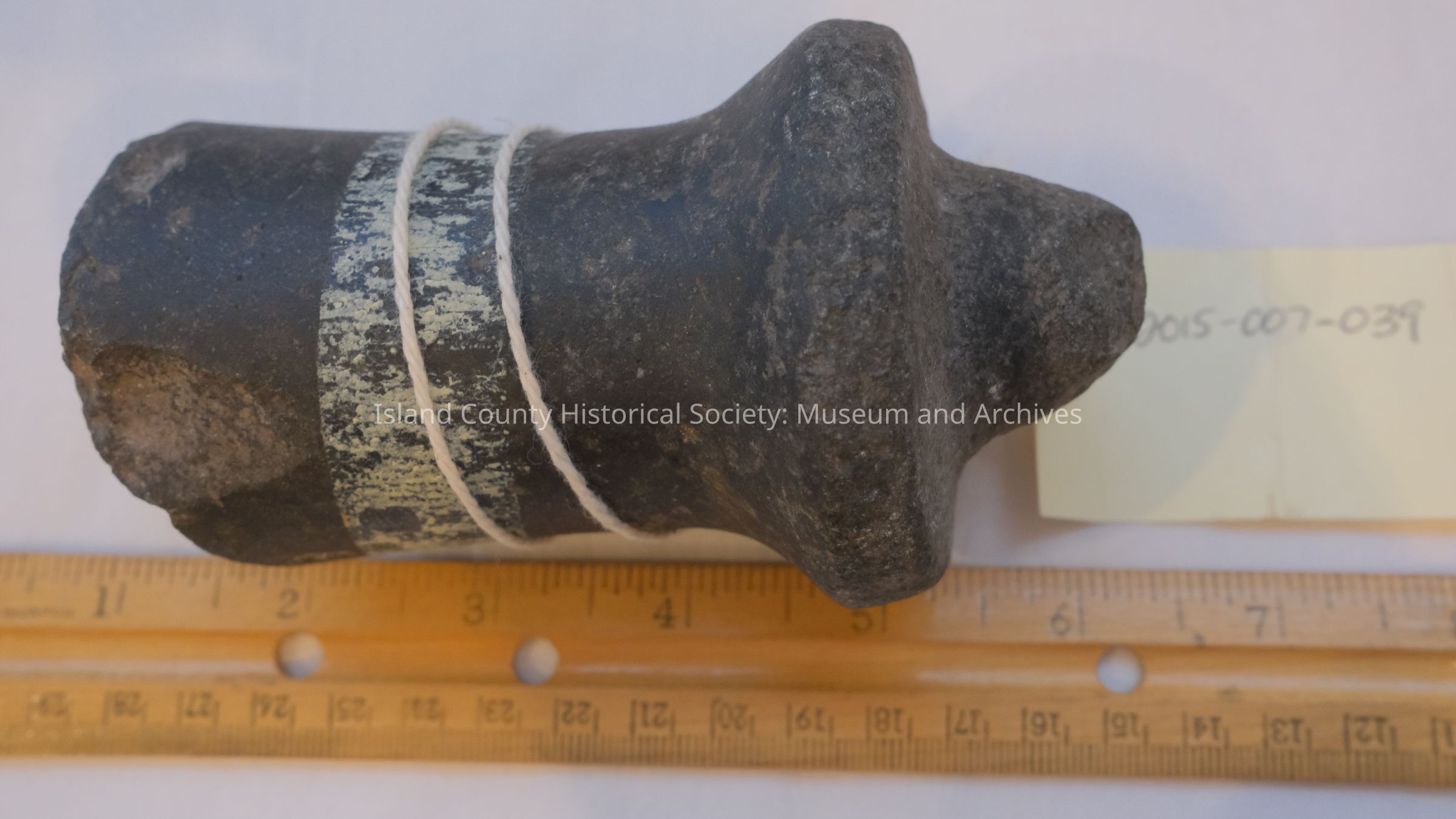 stone - worked, broken pestle Part of collection donated by Liane Thomas April 2015. Items were collected in the 1930's by Frank and Lane Emory (sons) on family farm (Ellsworth & Grace Emory) in the Crescent Harbor area of Oak Harbor. Donated in memory of Lane Emory.