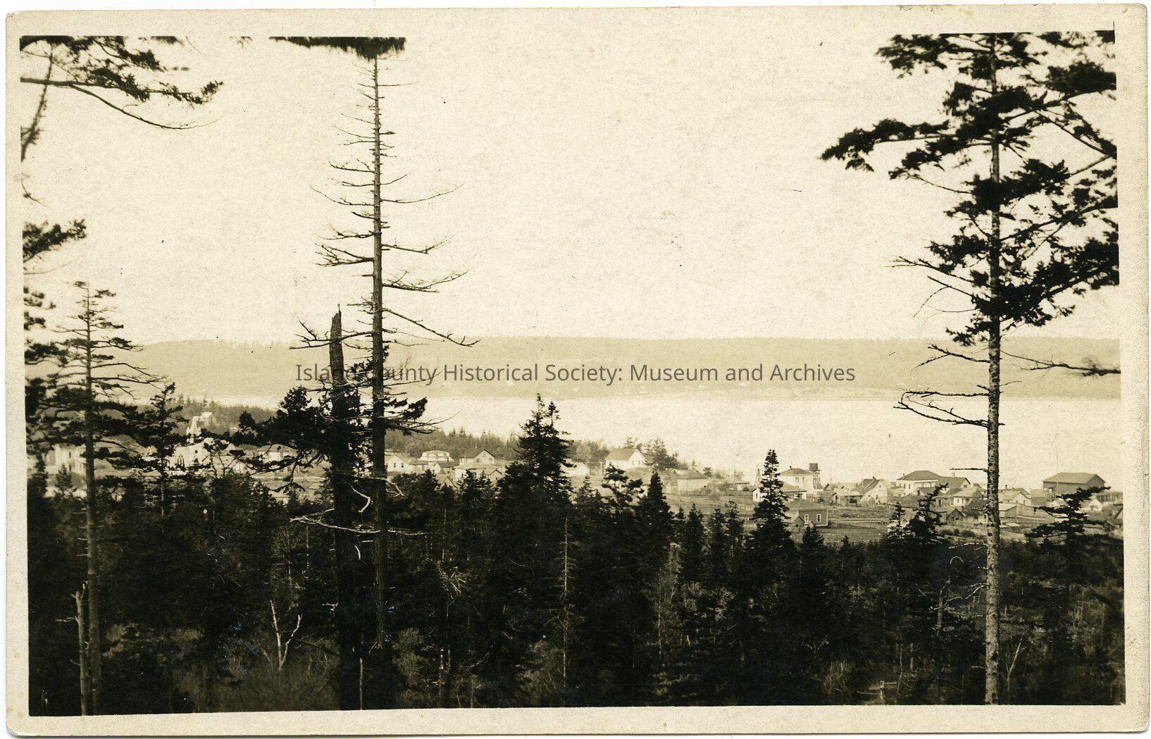 Postcard of a view of Coupeville looking north across Penn Cove. Trees in foreground. Town in center. Wharf on right. Water tower in the center. Church on left. On the back: Coupeville from S.E. 1900.