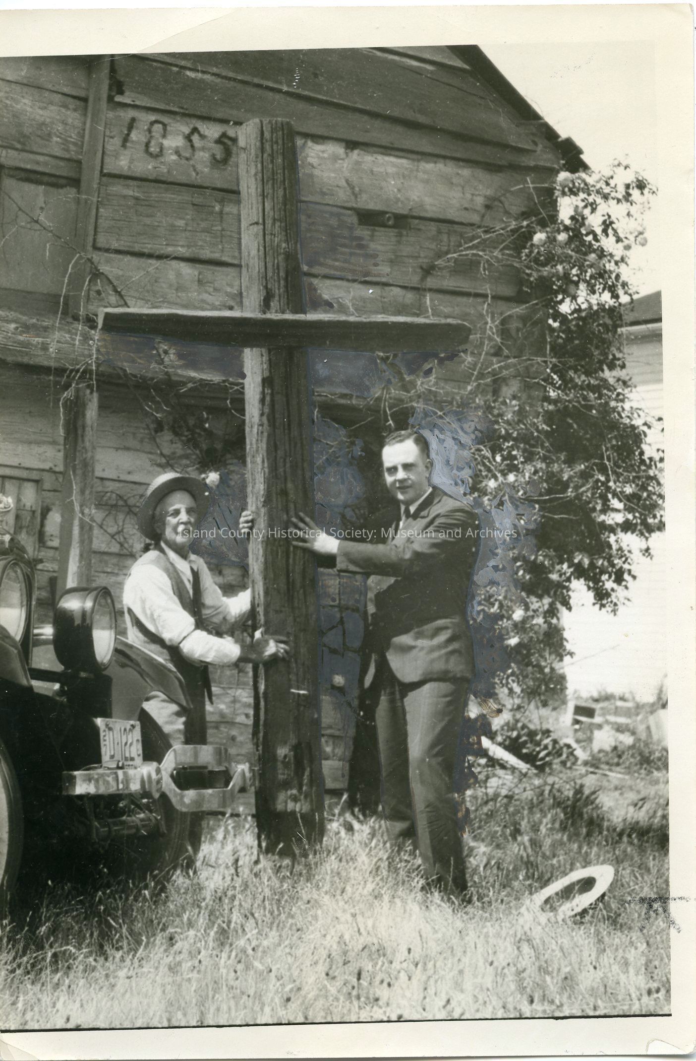 Photograph of Abram Lansdale Alexander (left) and D.C. Smith holding a historic cross outside Alexander Blockhouse, now located within a protected interpretation shed next to the blockhouse.