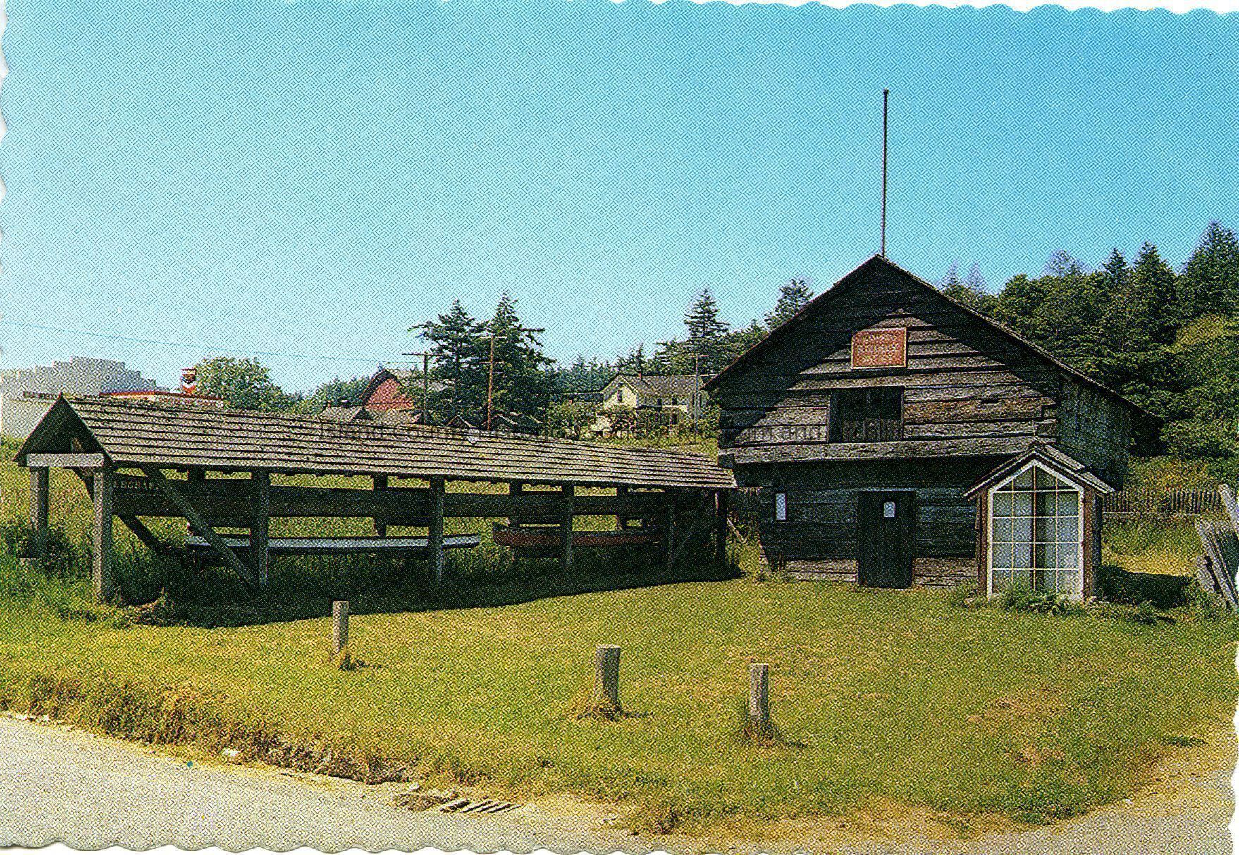 Postcard of the Alexander Blockhouse and Indian dug-out canoes in Coupeville, Washington. Actual year photo was taken is unknown, but appears to have been taken in the 80s. When looking at the photo the road leading back to the Coupeville Inn and Inn itself is missing. The Coupeville Inn was established in 1985. Color postcard published by Ellis Post Card Co., Arlington, Washington.Made/Created