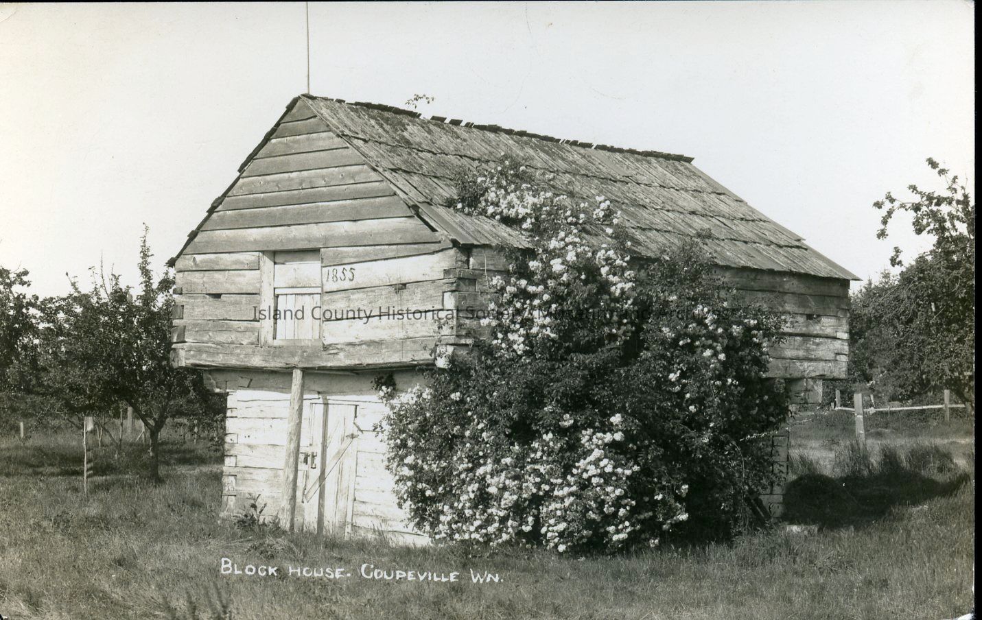 Postcard depicting Alexander Blockhouse. Reverse reads, "Dear Uncle Sid, I am in Coupeville attending the Indian Water Festival. A party of us boys made the trip on bicycles. I am sure having a swell time. Love to Ida. Bill Hage" Addressed to S.W. Bettes, 7815 72nd Street, Seattle Wash., 2815 West 72nd. Postmarked 12 August 1935, Coupeville, Washington. Photo c. 1935.Collection