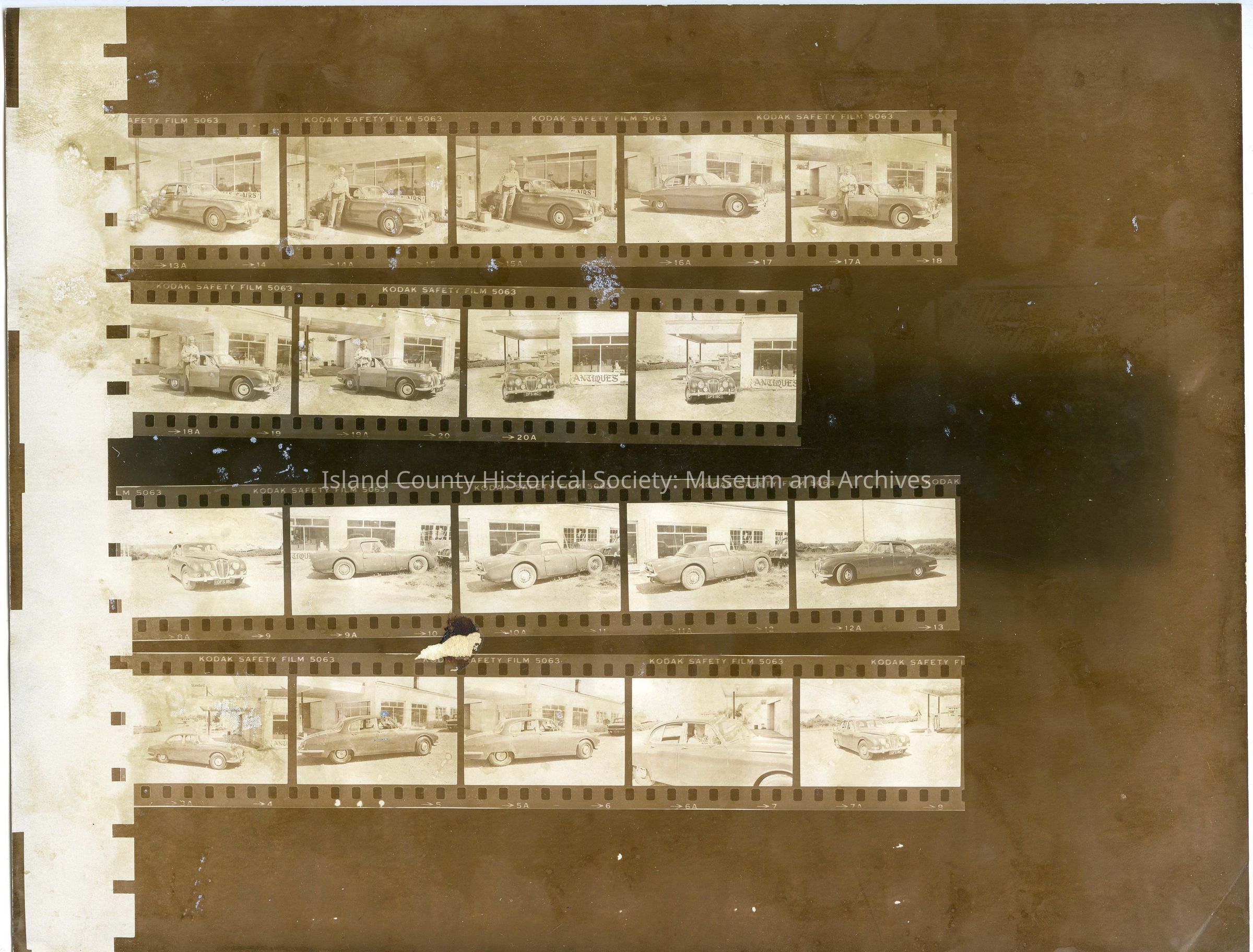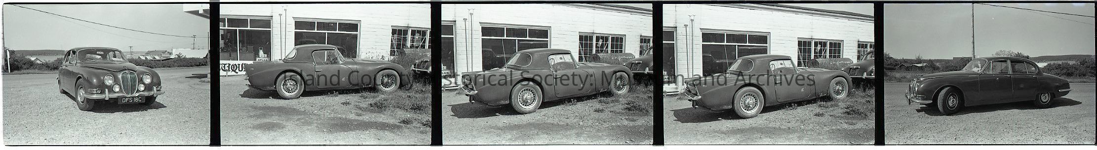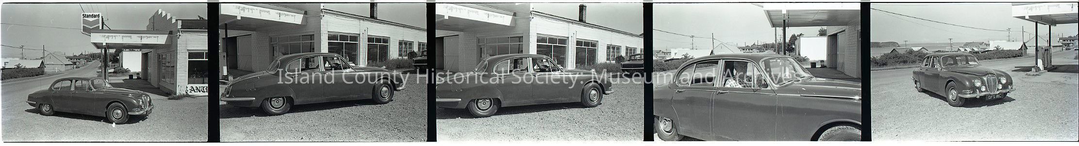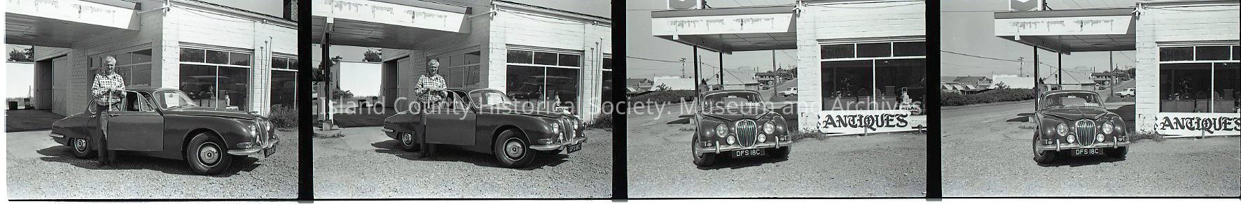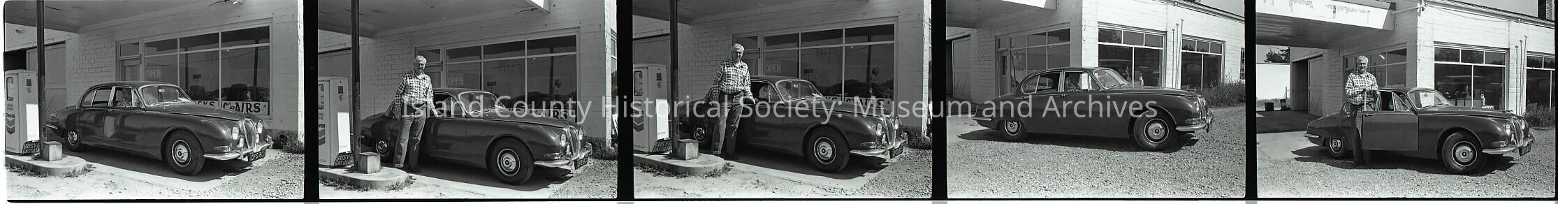 Negative strip of 5 frames showing a man, car and an automotive garage. The car is a Jaguar, with right-hand drive and a UK license plate.