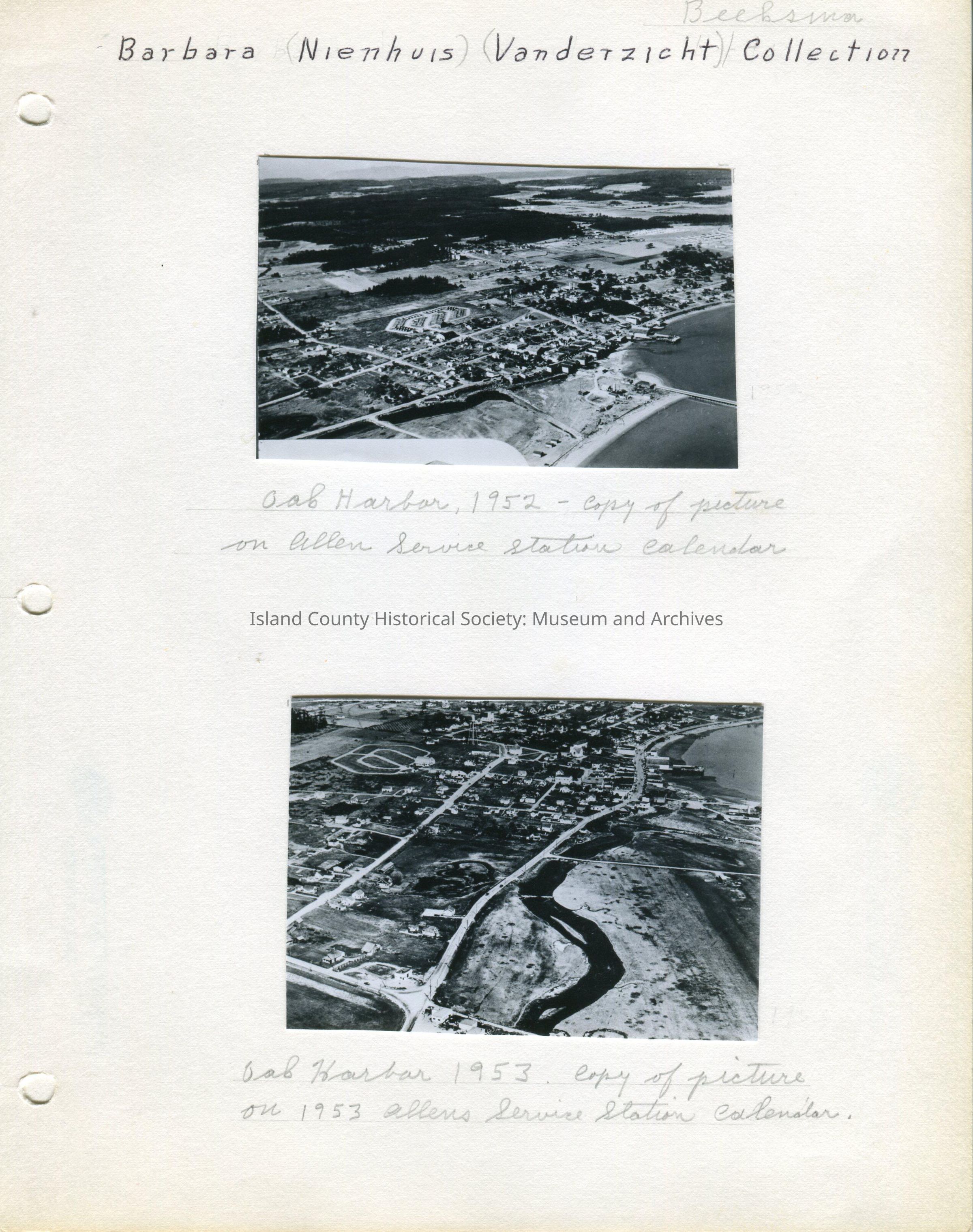 Top Center Photo - 4.25"W x 2.5"H - Aerial photo of Oak Harbor in 1952 showing the waterfront and main streets. Written underneath, "Copy of a picture on Allen Service Station calendar".