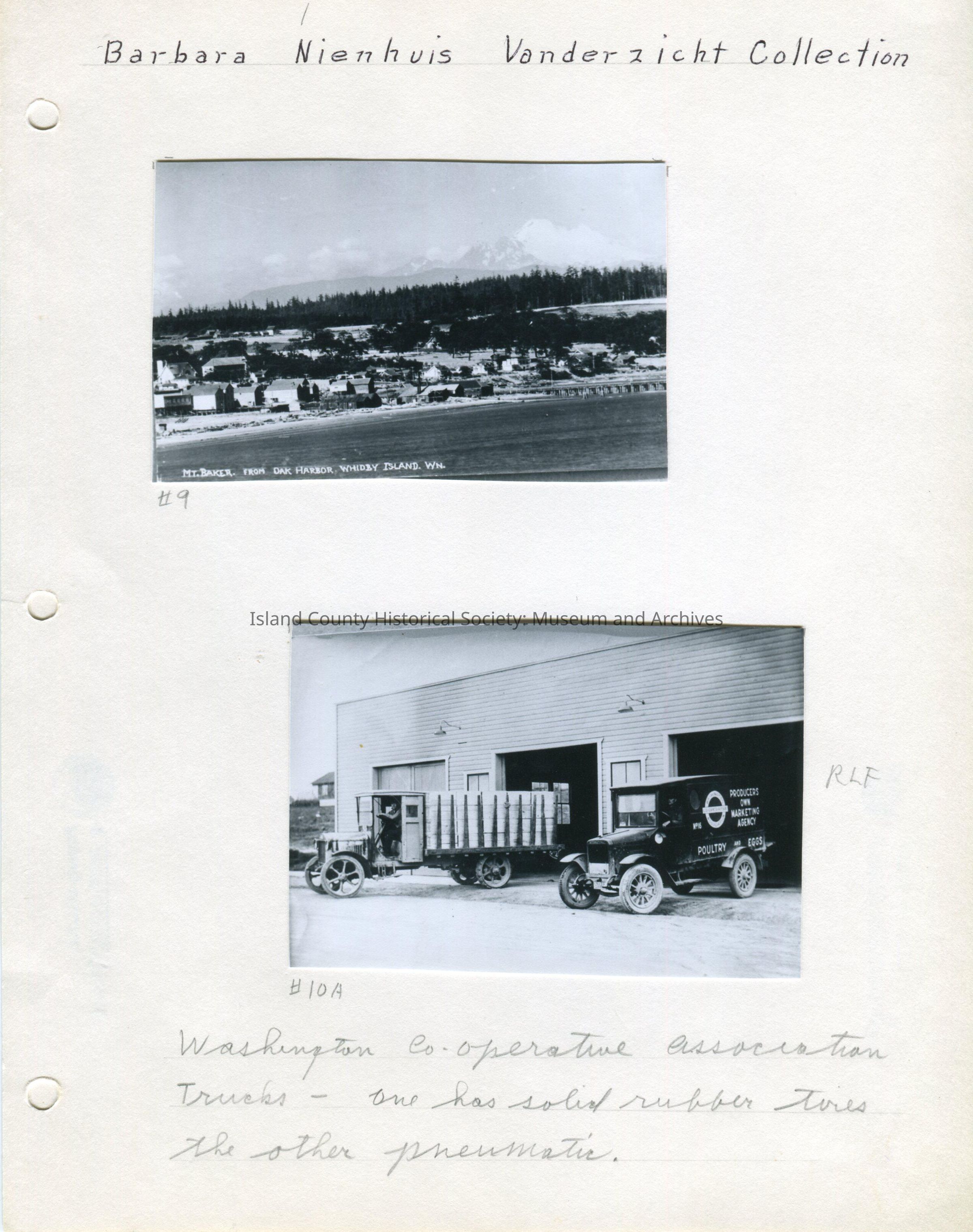 Bottom Photo - 4.5" W x 3"H - Photo of Washington Co-operative Association trucks parked in front of open garage doors at a warehouse. The truck on the left has wooden sides. The truck on the right is a black, hard-sided vehicle with the words, "Producers Own Marketing Agency, Poultry and Eggs". The note below the picture says the truck on the left has solid rubber tires and the one on the right has pneumatic tires. No date.Lexicon