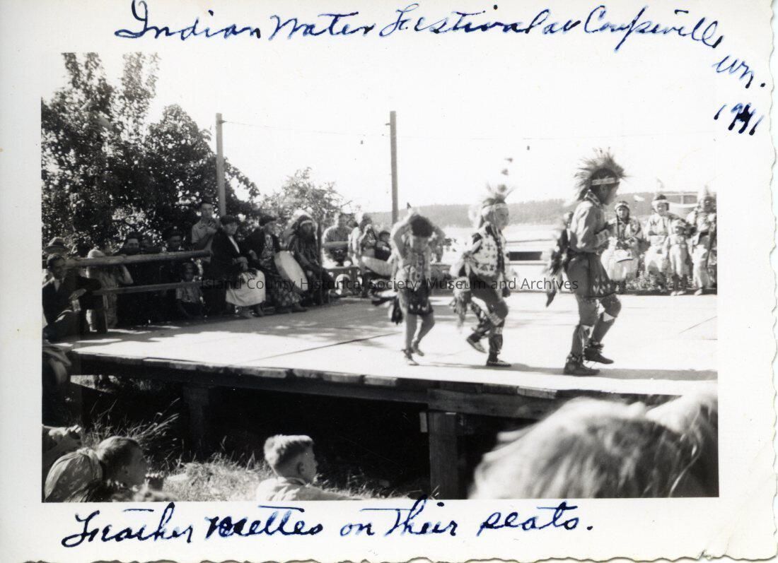 Black and white photograph of three Native American boys dancing on stage to the beat of a drum whilst fellow Native Americans and others watch. Tribespeople sit on the stage whilst others stand or sit around the stage. In the foreground are children sitting on the grass, watching. Photo has crimped edging on all sides. Photo was part of a small handmade card photo book bound with string. Photo by Madge Dean Swenson, aunt of Lillian Dean Huffstetler. Last festival for some years.Collection