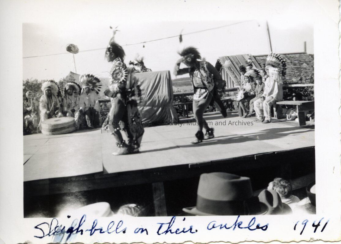 Black and white photograph of what might be a Native American war dance performance. Two Native American young men dance on stage in ceremonial dress. They face off to the side, one holding his right hand to his head. Bells are attached to their ankles and calves. They dance on a stage before an audience, whose heads pop up in the foreground. On two of the sides of the stage sit other Native American men, perching on wooden backless benches. Three to the left of the frame sit huddled around a large drum. Photo has crimped edging on all sides. Photo was part of a small handmade card photo book bound with string. Photo by Madge Dean Swenson, aunt of Lillian Dean Huffstetler. Last water festival for some years.Collection
