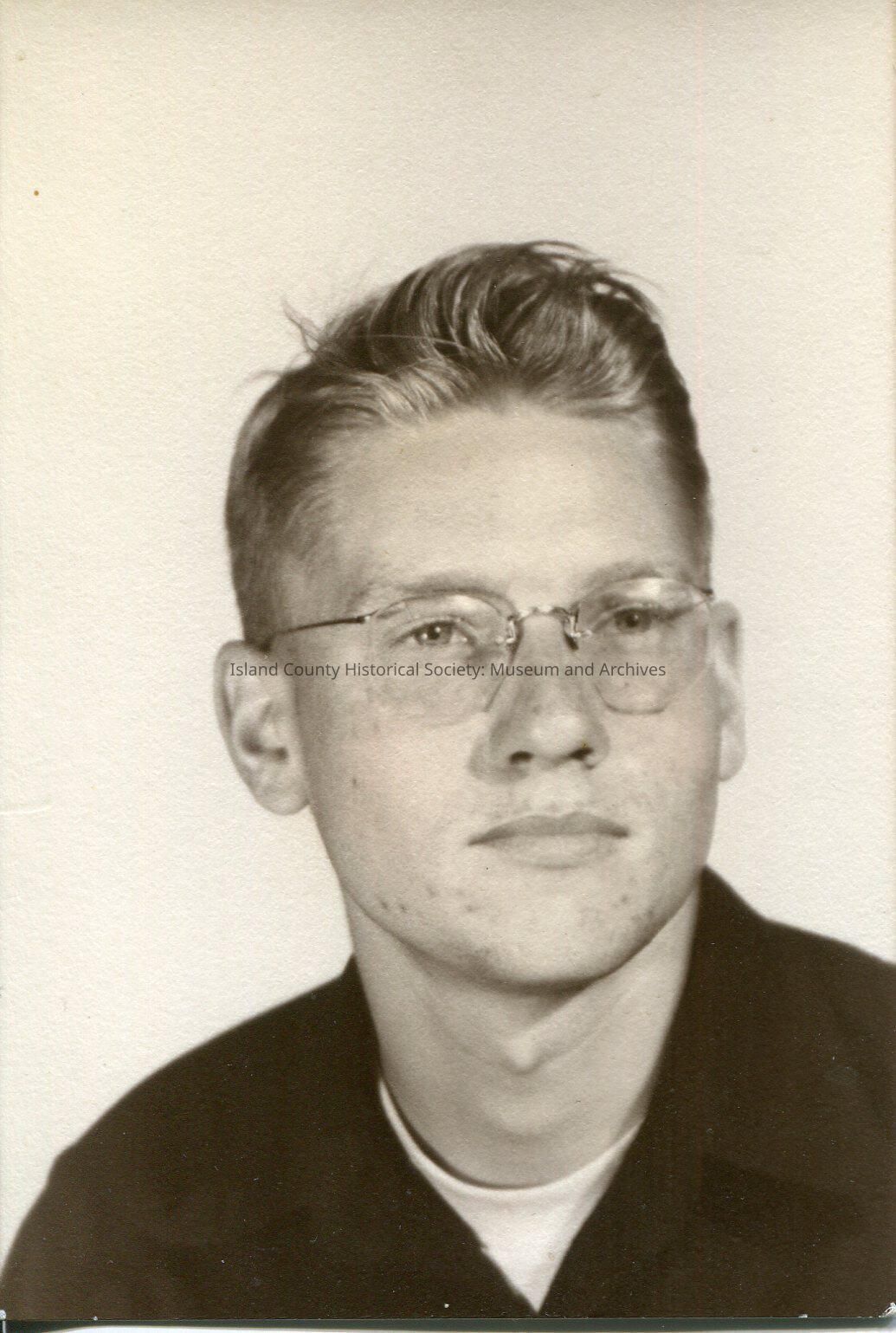 Digital copy only of a back & white school picture of a teenaged boy with round glasses wearing a sweater over a tee-shirt. This is Ron Van Dyk in what appears to be a high school photo. No date or description.