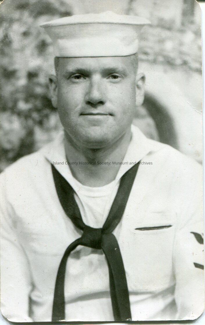 Digital copy only of a black & white photo of Ron Van Dyk as a US Navy sailor. He is smiling and wearing his white sailor suit, tie and hat. No date or description.