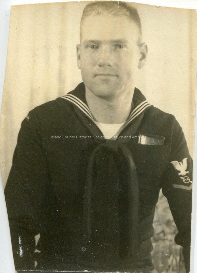 Digital copy only of a black & white photo of Ron Van Dyk as a US Navy sailor. He is smiling and wearing his dark sailor suit, tie and no hat. No date or description.